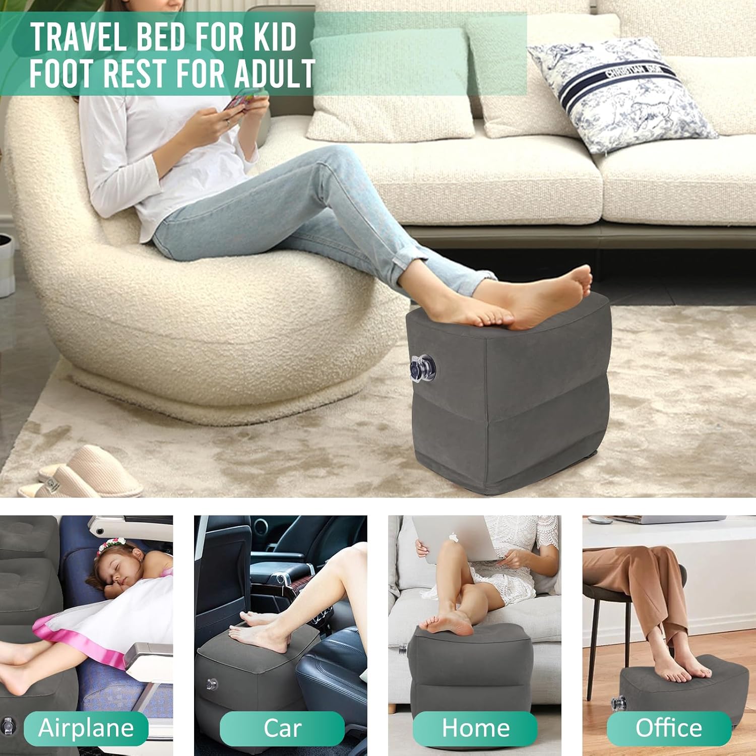 Comfort & Relax Anywhere: Our inflatable foot rest for air travel can be used vertically or horizontally to offer foot or leg support when long-time reading, gaming, watching TV at home, napping in the office or travelling by airplane, car, train. Fabuday travel foot rest for airplane flights will be a perfect companion and get your legs up for a good rest and better circulation