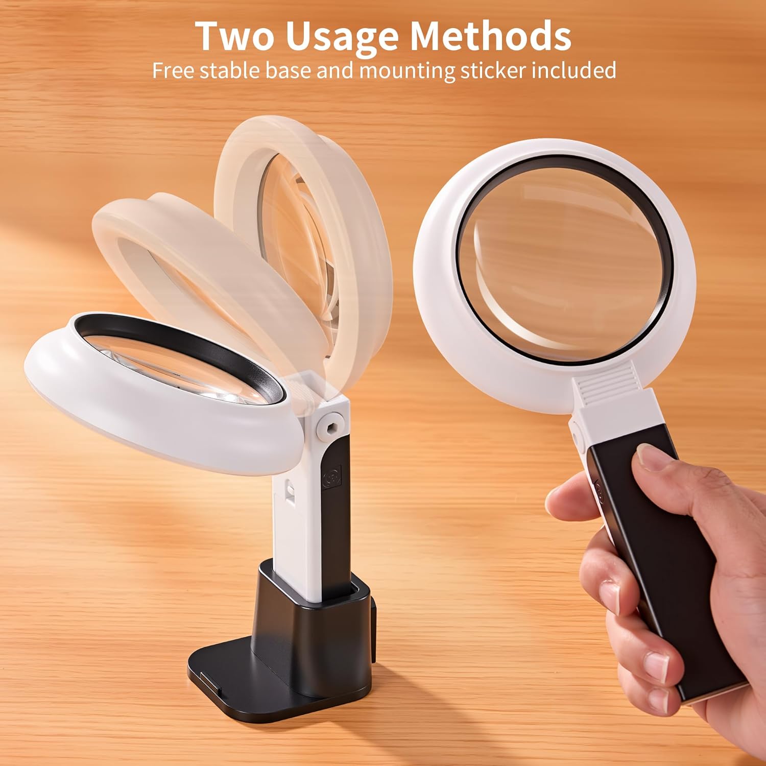 Review: I acquired this magnifying glass as a gift for my elderly father who sometimes needs a bit of help looking at things up close. He literarily enjoys reading the fine print, so when I saw this magnifying glass, I thought we could check it out. The glass itself is fairly decent in quality and you can get good magnification of items you are looking at. The LED ring on the parameter allows you to cycle through different temperature colors. While I tend to just stay on on color temperature, I could see how you might want to change the color based on the background you are viewing. The lights are powered by either two AAA batteries or a plug in via a USB cable. No AC plug is included, though. The device does not have a rechargeable battery unfortunately. It does come with a base for standing the unit upright, or you can use the double sided tape (included) to mount the base to the wall for either access or a space you want to permanently use at. The head of the glass does bend down for looking at things if you are sitting down and looking at an object, which great for small repairs or working on crafts. The plastic is ok, given the price range. My only small issue is that there are no rechargeable built in batteries. Other than that, it’s a decent magnifying glass that could be used for a variety of purposes.