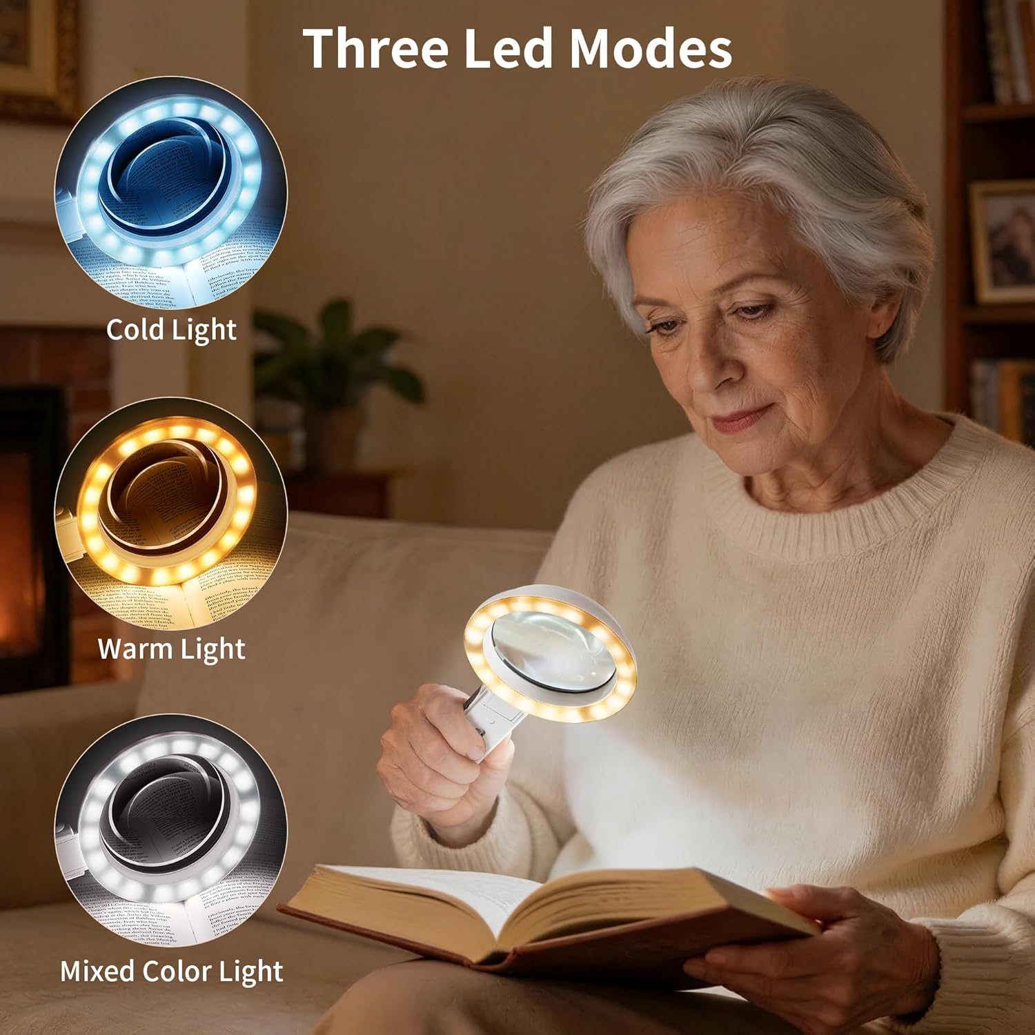 Review: This is a good value for a good quality, larger sized, handheld magnifying glass with a strong, bright LED light.Note that this is primarily a standard, removable battery powered light. It takes 2 standard AAA batteries (not included). It isn’t rechargeable.You do get a USB ended plug in cord. It’s not to charge it and can’t charge it. You can however plug the USB end into a USB power source, plug in or power bank (no electrical plug-in adapter is included). It will use the electric power through the USB cable to power it while it is plugged in.But it will not and cannot charge it. If you wanted to use rechargeable batteries, you would have to charge them outside of the magnifying glass. They state that plugging it in for use does not charge the batteries and that it will run off of the plug-in vs the battery while it is plugged inIt has a stand that you can set it in for use over objects or when reading. You simply set it in the stand and adjust the angle as needed.You can adjust the angle when you are holding it as well, not just in the stand. You can also use is at as a small light while in the stand either facing downward or outward.The LED is very bright and powerful with 18 built in LED lights. It’s an impressive amount of light and it lights up the area well.There are 3 light colors, cold (cool), warm, and mixed. The warm light is very amber toned. I prefer the cold and mixed color tones. You must turn the LED light off and on with a button press. You also press the button to select the color.The magnification area is large. If you look closely in the listing pictures they have pictures with measurements. The circular area of magnification inside the frame, as the usable area is 3.01” across and 3.01” tall (in a circle).Size: (see the listing pictures)-Total length: 8.46”-Width at base of the handle: 1.18”-Magnifying lens width: 3.01”-Magnifying lens height: 3.01”-Total width around the frame of the lens: 4.09”The magnification lens is acrylic, not glass.The magnification is fairly standard at 3X (3 times magnification). It’s not a super strong magnifying magnifier. It may not be magnifying enough for some applications and for some people.I did find it sufficiently magnifying for my eyes. I used it without glasses and instead of my 2.75 or 3 power magnification reading or magnification glasses (the measurement for reading glasses or bifocals).The handle is larger and easy to hold and grasp during use. The batter compartment is built into the handle and has a removable cover.It’s fairly lightweight and the body is plastic.Instructions are included. No storage case or bag is included.I didn’t notice any odor or scent to it. I would consider it safe for those sensitive to odors and scents.