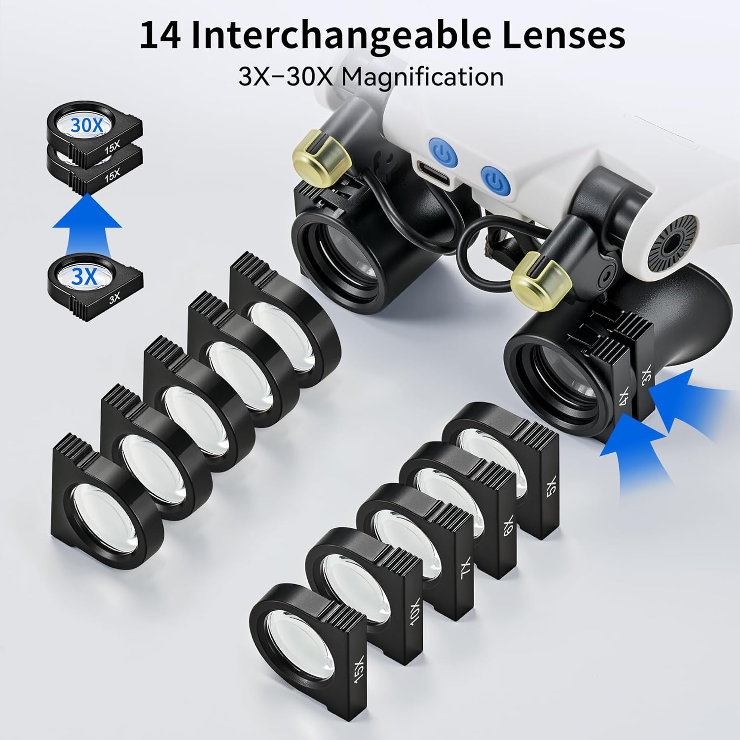 Review: Gamechanger for anyone needing precise, hands-free magnification, with a light. The lightweight frame also fits comfortably over regular glasses with adjustable straps, allowing me to keep both hands free for soldering or beading without the constant readjustment required by handheld magnifiers. The built-in LED lights —bright and adjustable, they provide even illumination without glare, making it easier to spot tiny details in low-light workshops.Kit came with 14 interchangeable lenses ranging from 3X to 15X, stored neatly in an included case. I frequently switch between the 3X-5X for broader views during sewing or general reading, and the higher 10X-15X for fine electronics work. The lenses snap in and out easily, and the optical quality is clear with minimal distortion at the edges, though I noticed slight chromatic aberration at the highest magnifications (15X) on very small objects. It’s designed for monocular use (one eye at a time) to maintain focus, which works well but might take a short adjustment period if you’re used to binocular setups. Has good battery life, lasting about 8-10 hours on AA batteries, and the overall build feels durable with reinforced plastic that holds up to daily use. The headband can feel a bit tight during extended sessions so I recommend loosening it periodically. Cleaning the lenses is straightforward with the provided microfiber cloth, but fingerprints can smudge them quickly. Overall, it’s comfortable for prolonged use, highly versatile with the lens options, and the LED lights make a huge difference in visibility.