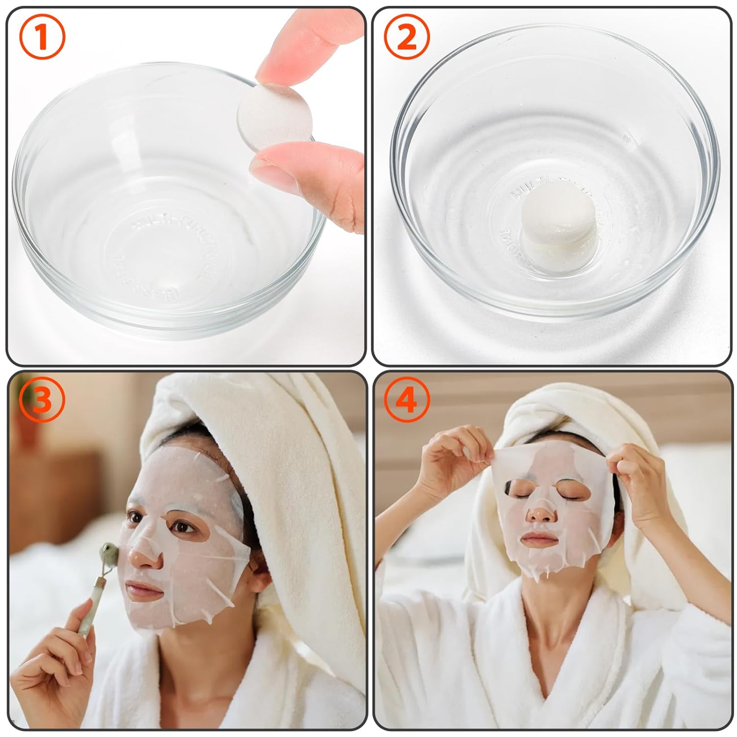 Easy to use: Those compressed mask sheets have strong adsorption ability, can soak the essential liquids quickly and transfer the essence of the mask sheet to skin. Just soap the compressed mask sheet in your skin care liquids, apply it to face and leave on for 10-15 minutes until the facial products is absorbed.