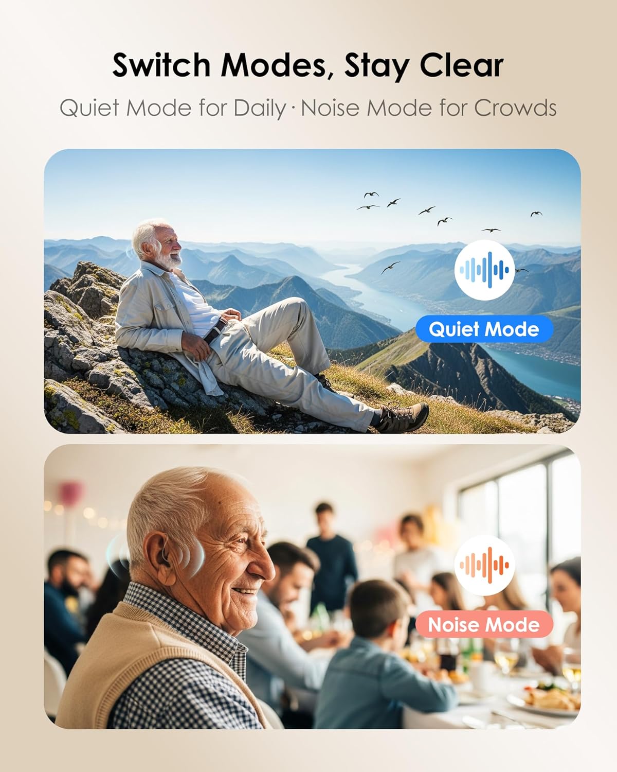 Review: I got these hearing aids for my dad,and they’ve really improved his daily life. The sound is clear and natural. The quiet mode works perfectly for watching TV or having conversations at home without background noise. No more asking people to repeat themselves. They’re comfortable to wear, the battery lasts a long time and charging is quick and easy. I like that he is able to adjust the volume easily.