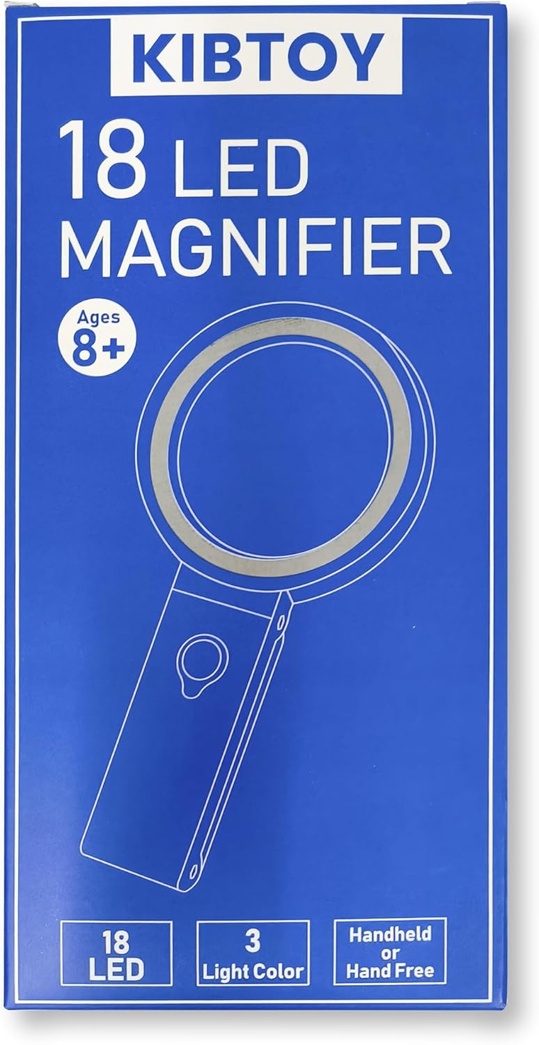 Review: Absolutely luv this “KIBTOY” magnifying glass! Able to be used handheld or hands free with the built in stand. Good weight & feels sturdy. The lights are great!!!! On button is conveniently located & easy to press. The lights have (4) setting, bright white (and it is!!!), warm golden light, medium white light, and a small pin type light to use with the super 30X little round glass.  I’ve used the mag glass a gazillion times already.  Especially good for reading medicine & vitamin labels and the #1 reason for choosing this quality 10X magnifying glass.  I also use it for reading paper docs at my laptop. I open the mag stand and slide it under the front or side of the laptop. Works great, bright light & able to see clearly! And, I’m a night owl, and don’t like to turn on lights. I use the handheld option with the lights to navigate the house, ck on pets, family, front & back porch, a/c setting (magnified), pantry raid (LOL!), without disturbing anyone!!!! Game changer for a night owl like me!  I think this “KIBTOY” magnifying glass is the most useful, and certainly the most frequently used tools, I’ve ever owned!!! Uses (3) AAA batteries. Very affordable! Highly recommend!