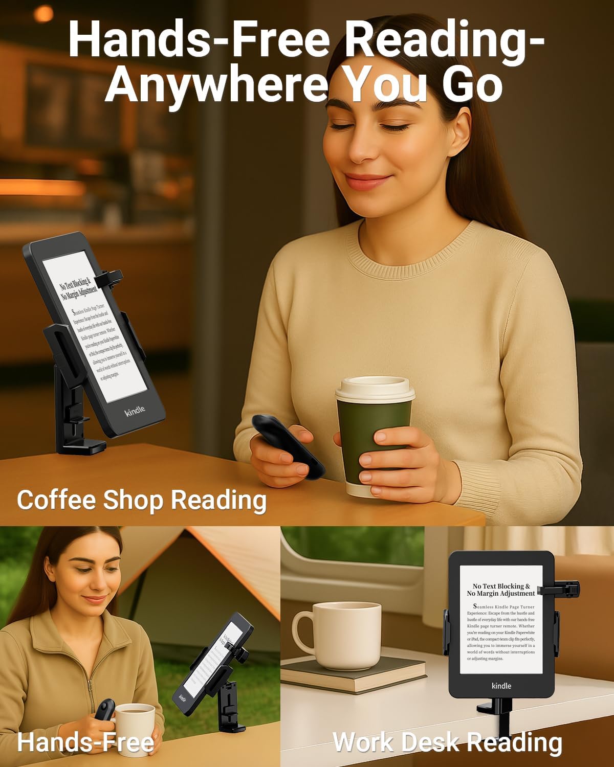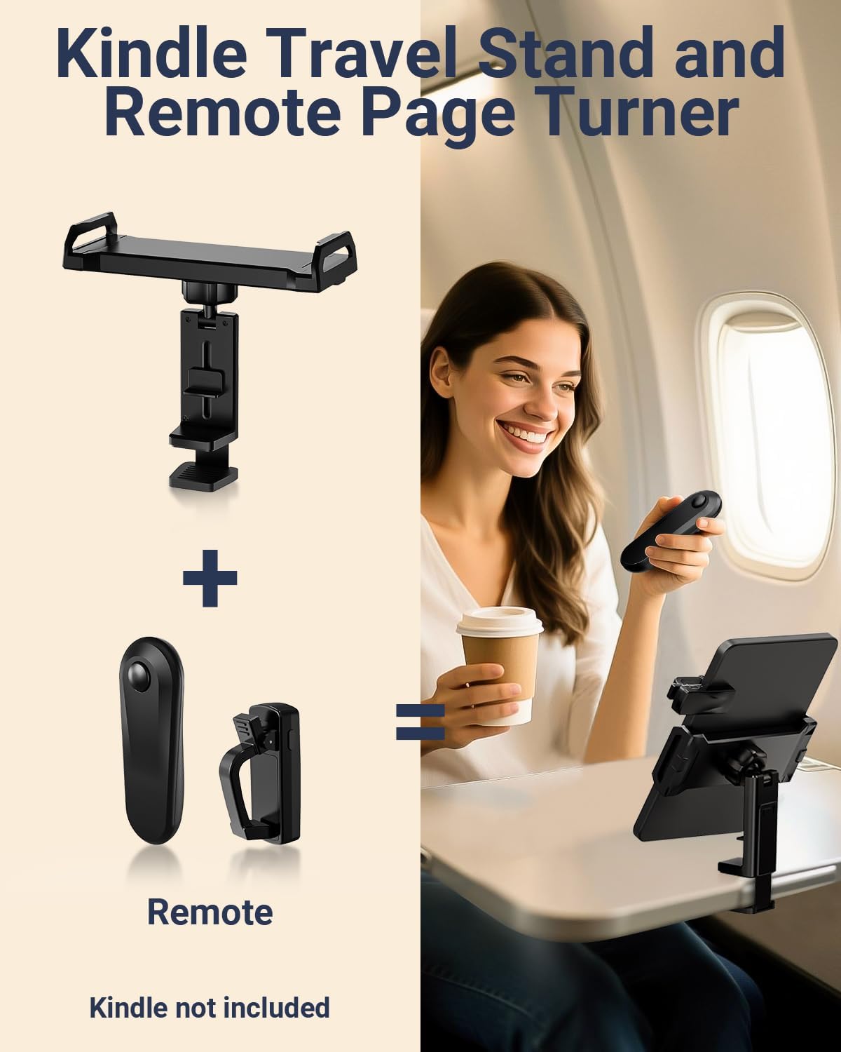 Review: As someone who travels frequently, I spend a lot of time on airplanes, and reading on my Kindle has become my favorite way to pass the hours. Holding a Kindle for long periods used to make my hands sore, and constantly swiping to turn pages was tiring. This travel stand has completely improved that experience. I can clip it to the small airplane tray or even the seat, and it holds my device steadily. The Bluetooth page turner makes flipping pages effortless. With a simple tap, the page changes, letting me stay immersed in the story without lifting a finger. The adjustable angles make it easy to find a comfortable position whether I am leaning back in my seat or sitting at a train table. It is lightweight and folds flat, so carrying it in my bag is easy. I have also used it while camping and in airport lounges, and it feels just as sturdy anywhere. Reading has become much more relaxing, and I can enjoy longer sessions without any discomfort. This stand and clicker combo has made traveling with my Kindle much more enjoyable.