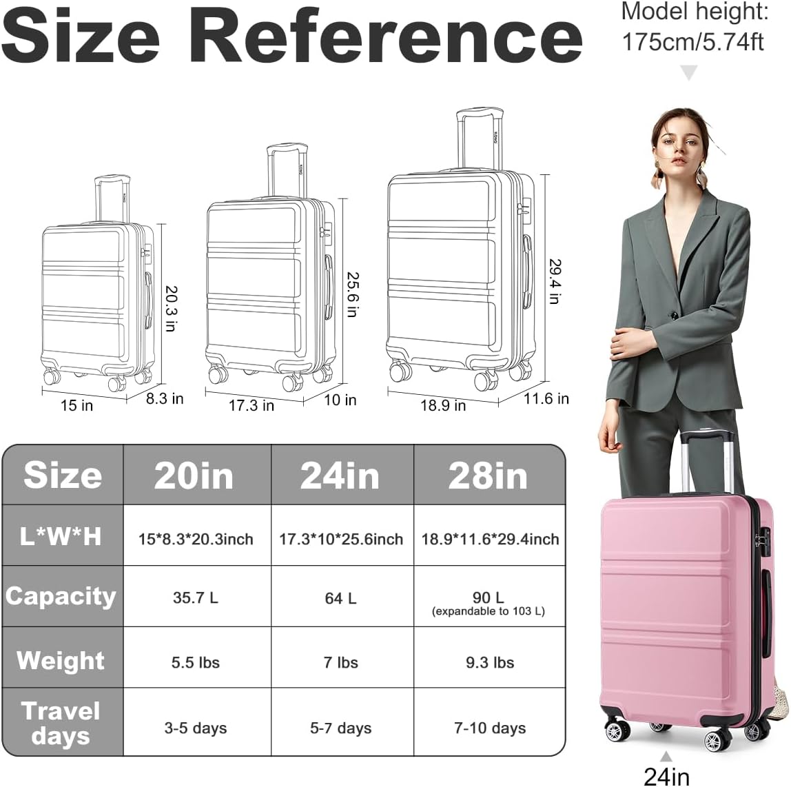 【24 INCH SPINNER LUGGAGE DIMENSIONS】Overall: 25.6" x 17.3" x 10". Packing: 23.6" x 17" x 9.8". Weight: 7 lbs. CAPACITY: 64L. Kono lightweight 24" suitcase maximizes your packing power and is the ideal checked bag for longer trips. Perfect for 5-7 days trips!