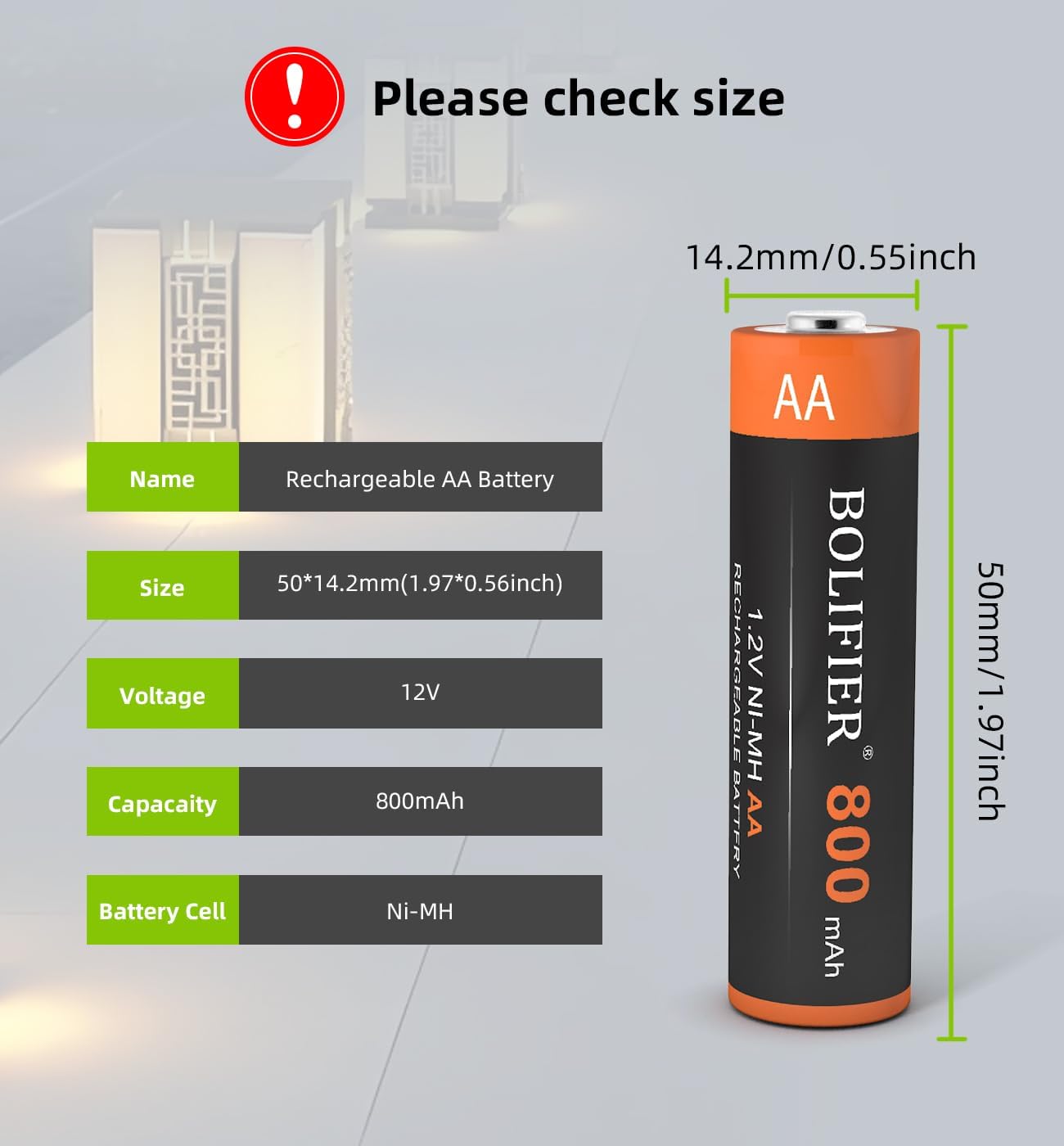 Capacity: 800mAhVoltage: 1.2VChemistry: NiMHCycle Life: 1500Working Temperature:-4°F to 122°F degreeDoesn't contain Hg/Cd/Pb, no pollution to the environment.