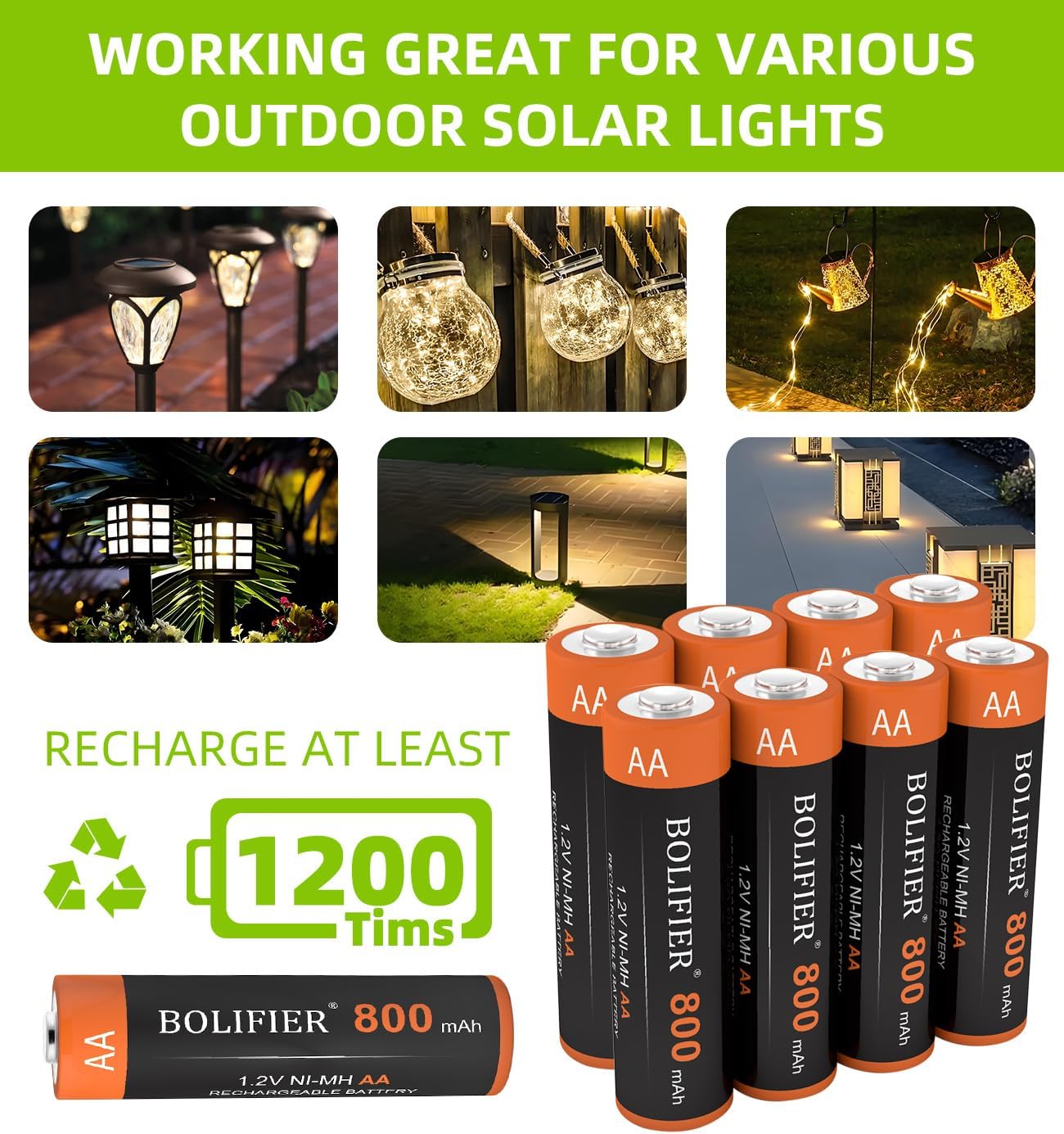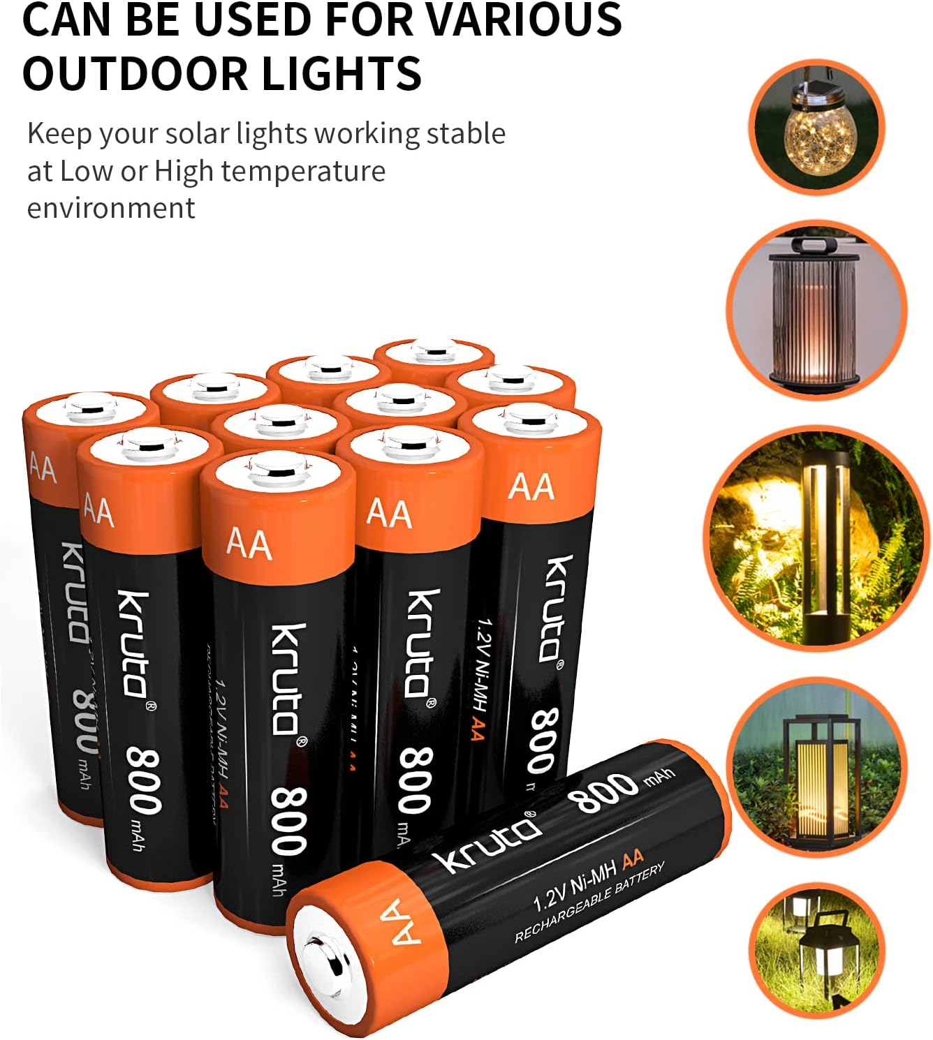 Kruta Ni-MH Solar AA Battery with 800mah real large capacity, expanding the service time of the batteries, more durable and better performance than Ni-CD battery and small capacity battery. The High Capacity AA Rechargeable Batteries can give you more time to run with solar garden lights.