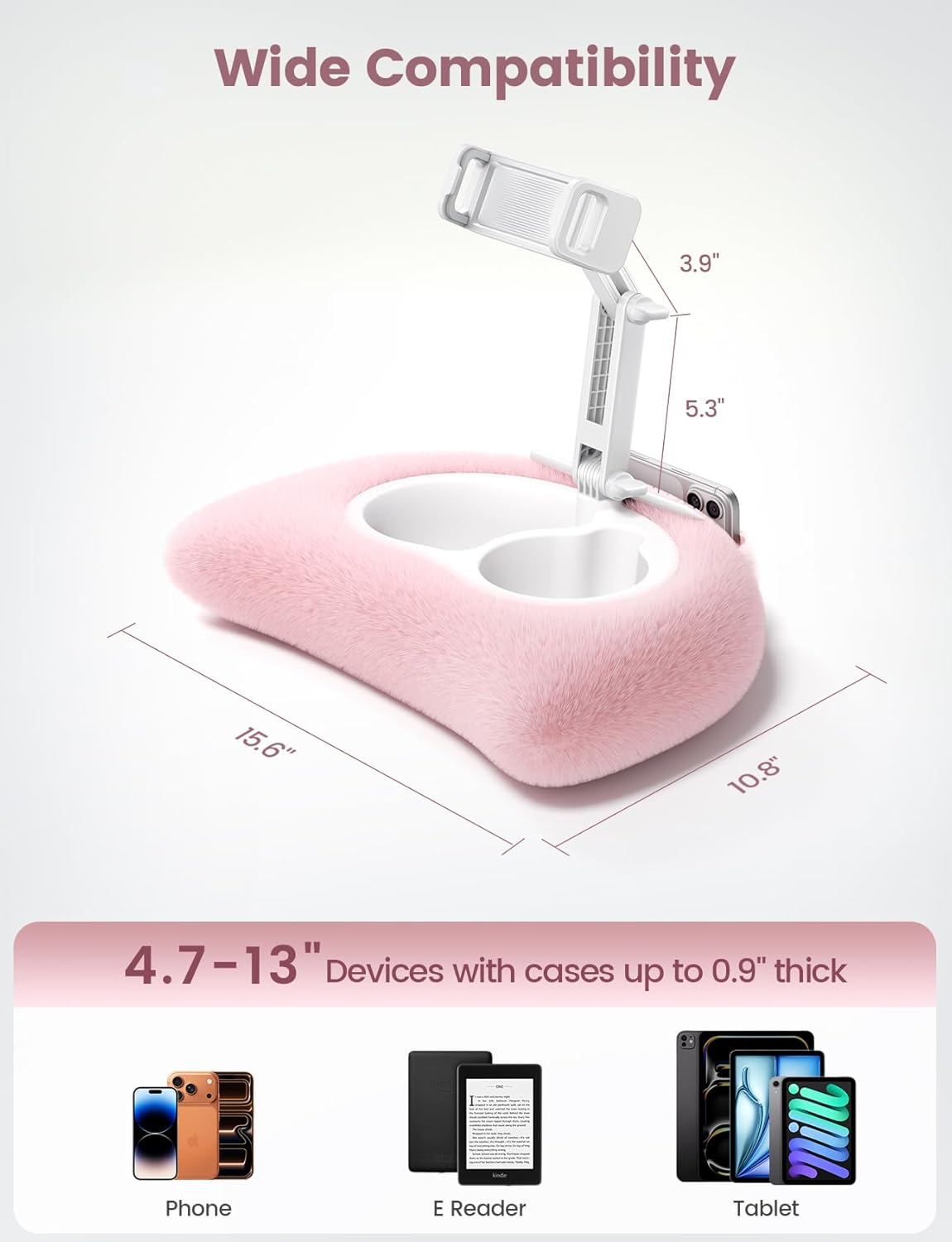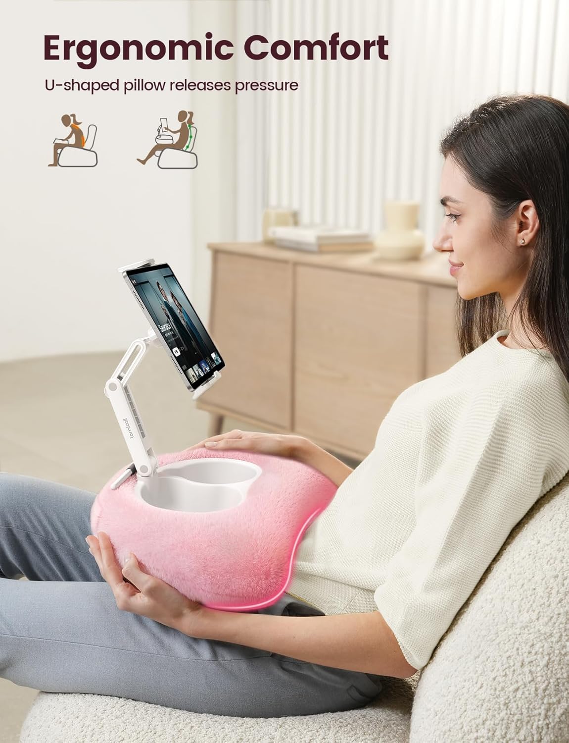 Review: I got this tablet pillow stand for my wife, and she absolutely loves it. She mostly uses it with her Kindle, and it’s made a big difference for reading in bed. Being able to position the screen exactly where she wants it means she can read hands-free without holding the device up, which keeps her arms and neck from getting tired.The pillow base is surprisingly comfortable. It’s soft but supportive, and the U-shaped design sits nicely on the lap without digging in. It feels stable whether she’s sitting up or slightly reclined, and it stays put instead of sliding around. The adjustable arm and rotating clamp make it easy to fine-tune the angle, so the screen is always in a comfortable viewing position.We also really like the color. The pink is more of a soft, pastel shade rather than anything loud or bright, and it’s very easy on the eyes. It looks pleasant in the bedroom and feels cozy, rather than distracting.The little organizational features are more useful than they sound. The front pockets and pen loop are handy for keeping a phone, remote, or stylus nearby, and the bowls are convenient for small snacks without needing an extra table. Everything stays within reach, which adds to the overall relaxed, comfortable setup.Compatibility hasn’t been an issue. It holds the Kindle securely, and it looks like it would work just as well with a tablet or phone. Cleaning is also simple, which is a nice bonus for something that gets used daily. The removable cover can be tossed in the wash, and the bowls wipe clean easily.Overall, this has been a great comfort accessory. It’s well thought out, genuinely useful, and makes long reading sessions in bed much more comfortable. If you or someone you’re buying for enjoys reading or watching shows hands-free while relaxing, this is an easy recommendation.
