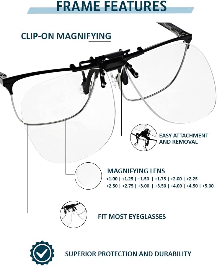 B09QTZZGJ1, The Clip On Flip Up magnifying readers is a smart alternative to turn most eyewear into bifocal reading glasses. This clip on features small lenses with available magnifying +1.00 to +5.00. Plus, it is easy attachment and removal, with superior protection and durability. Our clip-on flip-up magnifying readers are made to fit most safety glasses. Magnifying readers are great if you do occasional close-up work. Their main use is with periodic close-up examination, reading, and writing. Easy attachment and removal, superior protection and durability, and customized prescriptions mean…, 3.5, , Health & Household > Vision > Reading Glasses, #Large #Clear #Clip #Flip #Reading #Glasses,