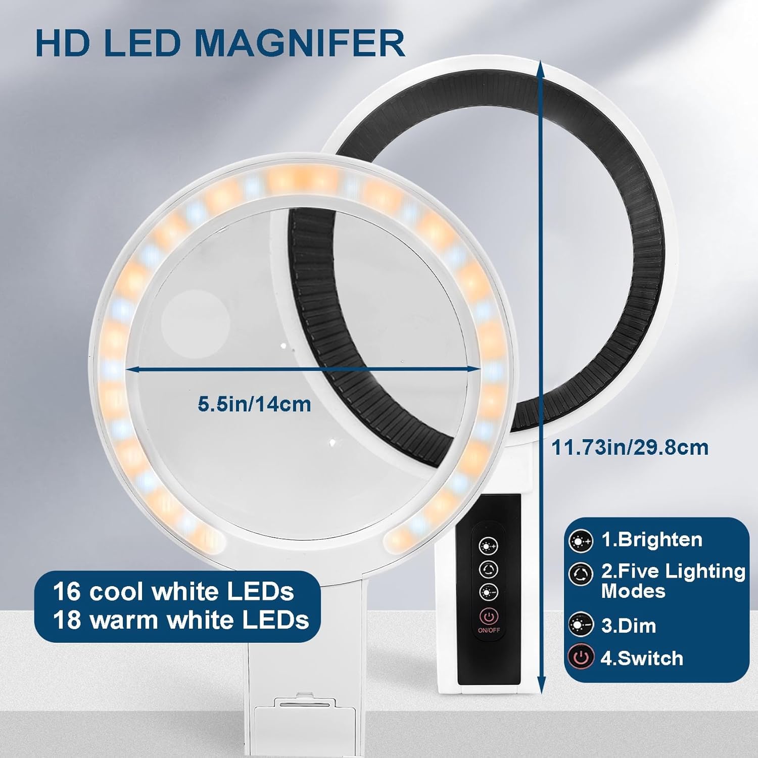 Review: I bought this magnifying glass for my dad. This glass is with light and it is awesome. The big lens gives a clear, close-up view that makes reading small print so much easier. It has 10X magnification, 10 times! There’s even a little 30X spot for extra tiny details like coins or jewelry. The built-in lights are super bright, and I really like that you can choose between warm or cool light. There are five light settings and you can adjust the brightness, which helps a lot if your eyes get tired easily. My dad uses it day and night in any rooms with no problem at all.He likes to hold it in his hand or set it up on the stand and go hands free. The handle is comfortable to hold, and the stand is strong and easy to use. The battery lasts a long time and charges quickly with a USB-C cable. He uses this for reading, crafts, and medicine bottles. It’s also a great gift for anyone who has trouble seeing tiny print. This tool is very helpful, easy to use, and works really well.