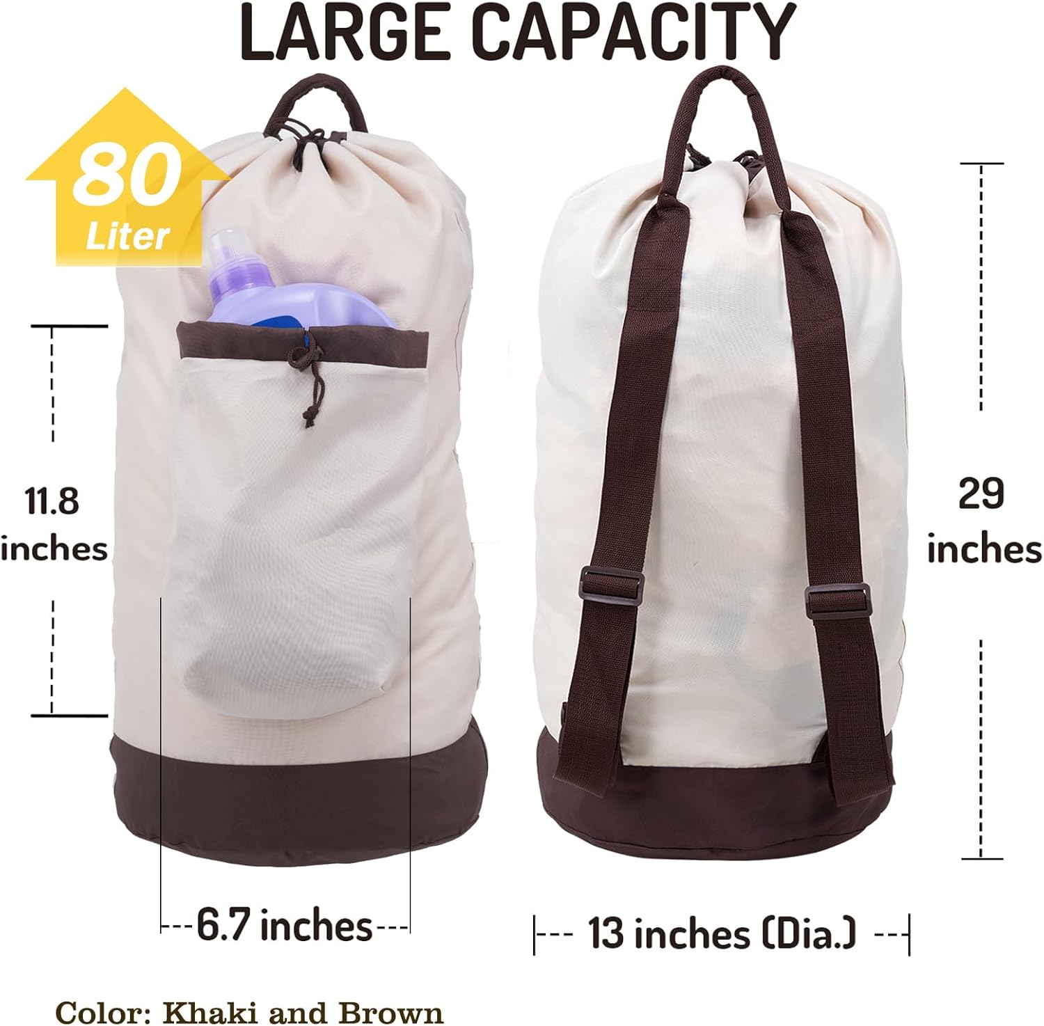 LARGE BAG CAPACITY: The laundry bag measures 13 x 29 inches (Dia.*H), max Dia. is 24 inches, the capacity is up to 80L, the size is big enough to hold 2 to 3 loads of dirty clothes. Designed to bear a load of weekly laundry, perfect capacity for laundromat use or family use