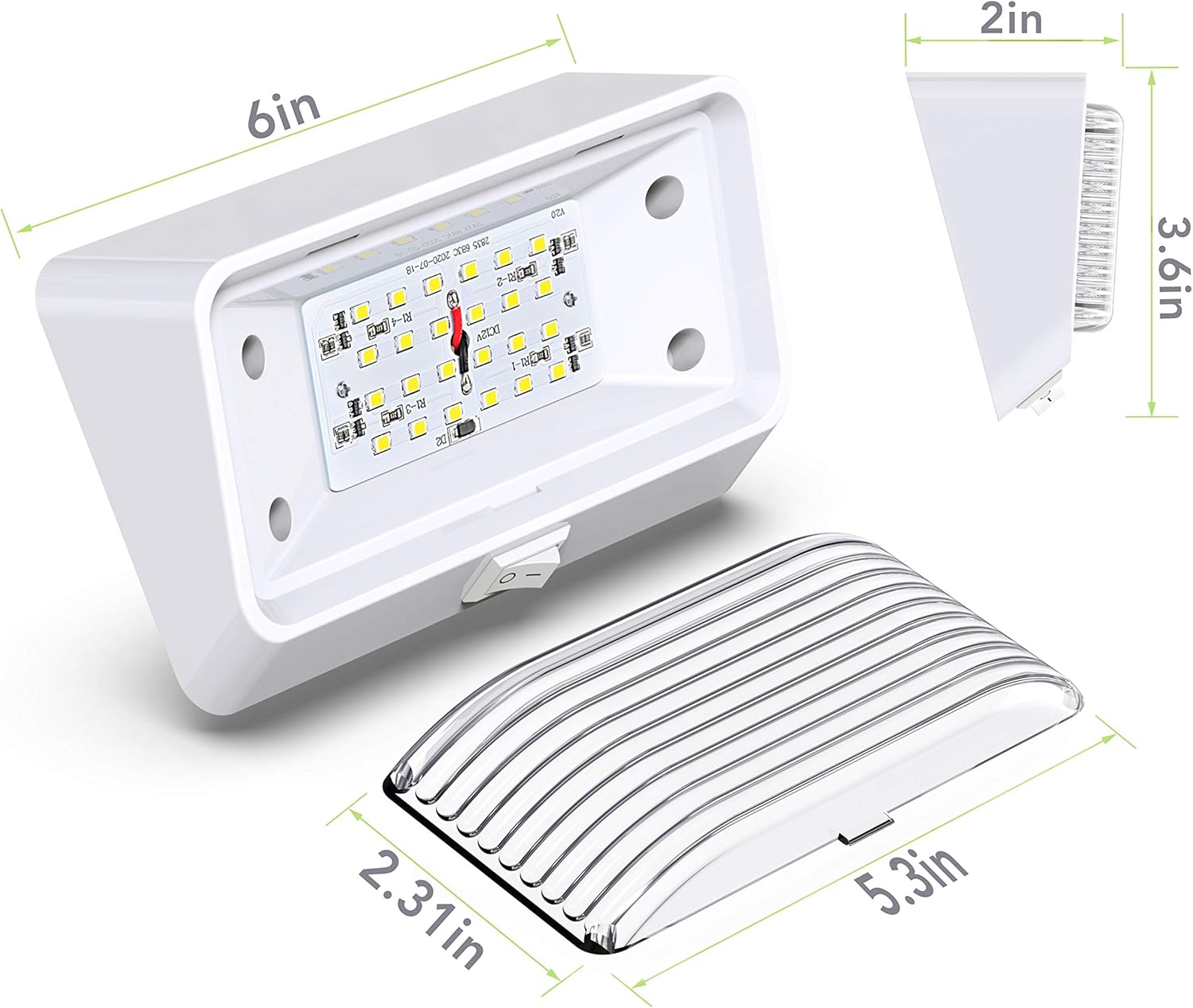 Waterproof: IP65Brand: Leisure LEDLED type: SMD 2835, 24pcsLight color: Cool White 6000-6500KPower: 2.7 WattsLumen: 280LMOperating voltage: DC 10-30VSize: 6"(L) x 3.6"(W) x 2"(H)