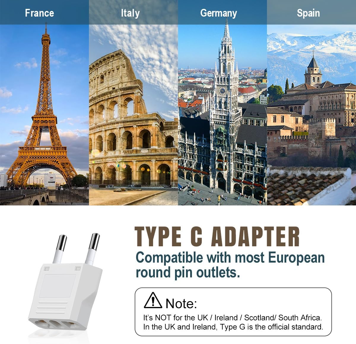 EUROPEAN TRAVEL PLUG ADAPTER: The type C plug adapter is compatible with most EU countries, such as Germany, Italy, France, Spain, Austria, Belgium, Croatia, and so on. (Not for use in the UK/Ireland/Scotland/South Africa.)