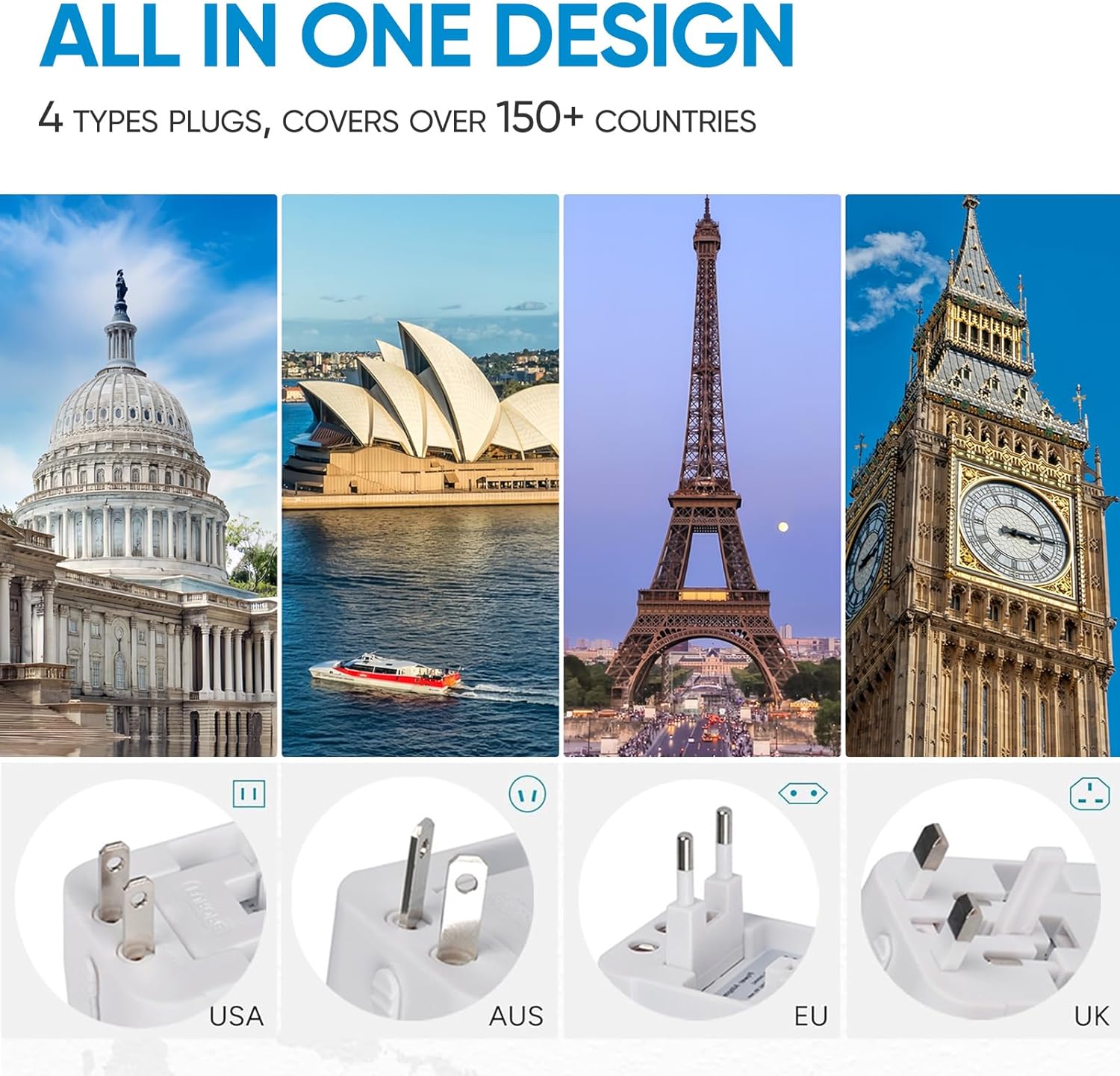 Worldwide Adapter - Our all-in-one adapter includes 4 different plugs that cover over 150 countries, such as USA, Canada, Japan, UK, Ireland, Scotland, France, Germany, Spain, China, Australia, Argentina, New Zealand, etc. (excluding South Africa, India). Ideal for your worldwide travel or business trip.