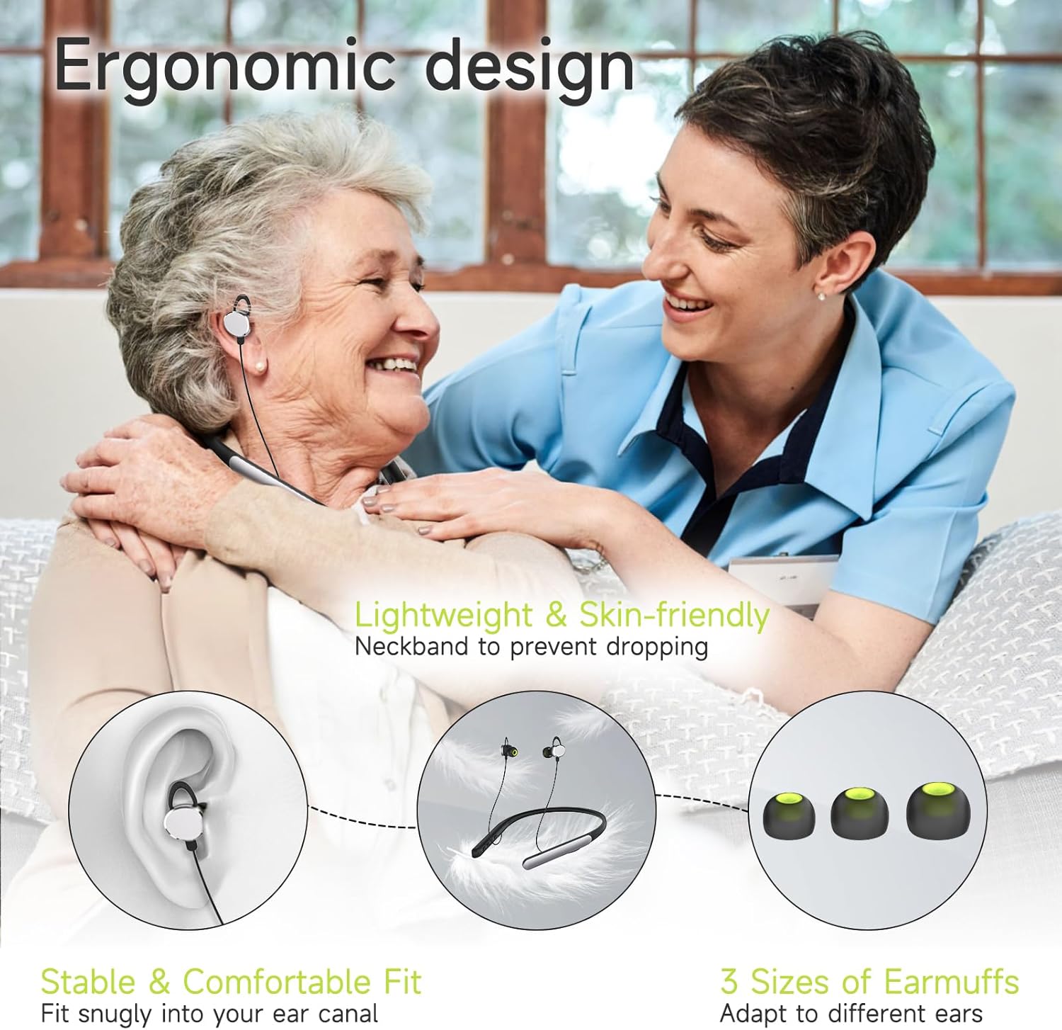 Review: Purchased for my 89 year old father who can not hear at all. They work great and the best part is he can’t loose them as they are attached to the neck band. The only issue is you can’t always tell if they are on as the green light that indicates you have turned them on stops indicating they are on after they have been on for about 5 minutes. It would be nice if they kept the light flashing every 30 seconds when they are on. Would also be nice if a red light came on when the battery needs to be charged so there is a STRONG visual reminder that it is time to recharge them. As noted you can’t beat them for the price and the ease of use.
