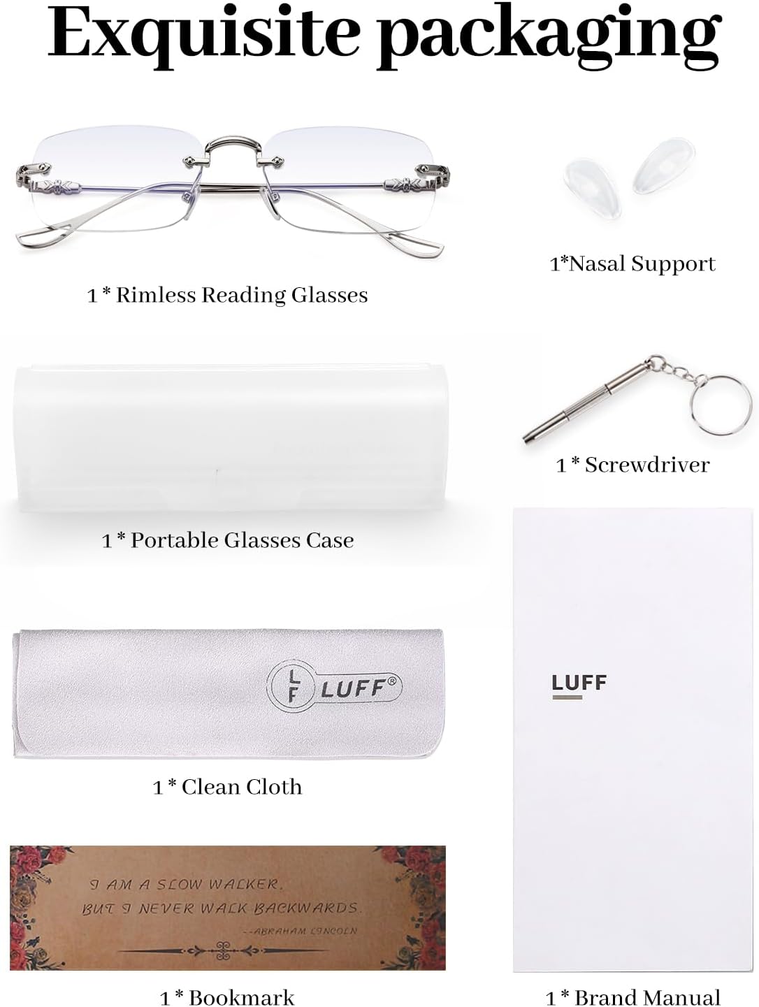 Review: I have purchased several pair of Luff Frameless reading glasses and they are perfect! The frames are intricate and beautiful. The material used for the actual “glass” is crystal clear, not easily scratched, and they protect against the blue light from a laptop or computer. I have had readers from the eye doctor that cost a lot more but they can’t beat the price of Luff glasses. I will keep a constant supply so I am never without their readers. Thank you, Luff for such a perfect product. (also a solid case, not just a fabric pouch, and a cleaning cloth, plus a tiny screw driver that fits in the pouch in case you need a quick touch up.)They thought of everything!