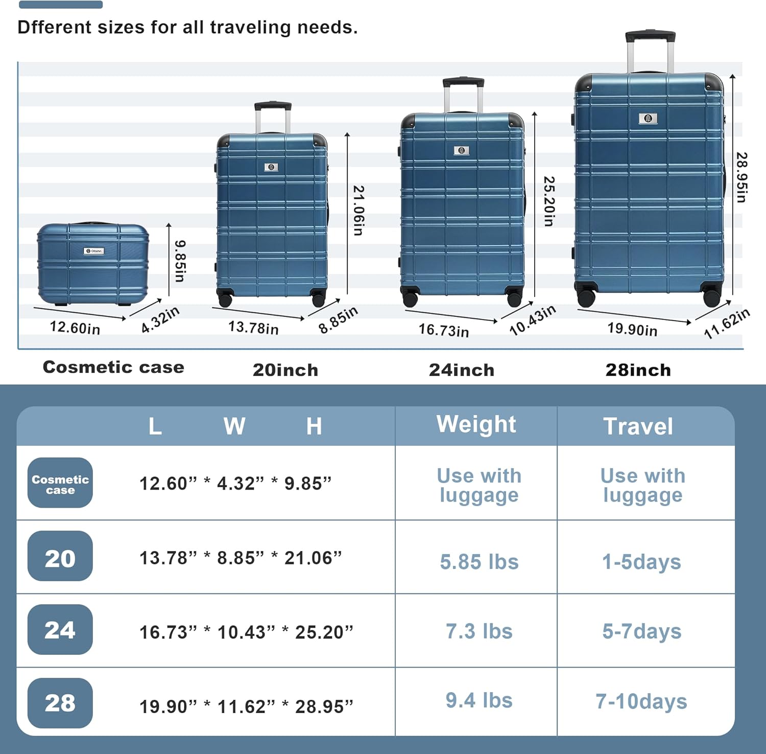 OVERALL SIZE: 12"mini cosmetic cases:12.80 x 6.70 x 9.65inch, 2.5lbs. 20" carry on luggage: 22 x 8.7 x 15inch, 6.5lbs. 24" checked luggage: 26 x 10.3 x 18.1inch, 8.16lbs. 28" checked luggage: 30 x 12.2 x 20.5inch, 10.25 lbs.