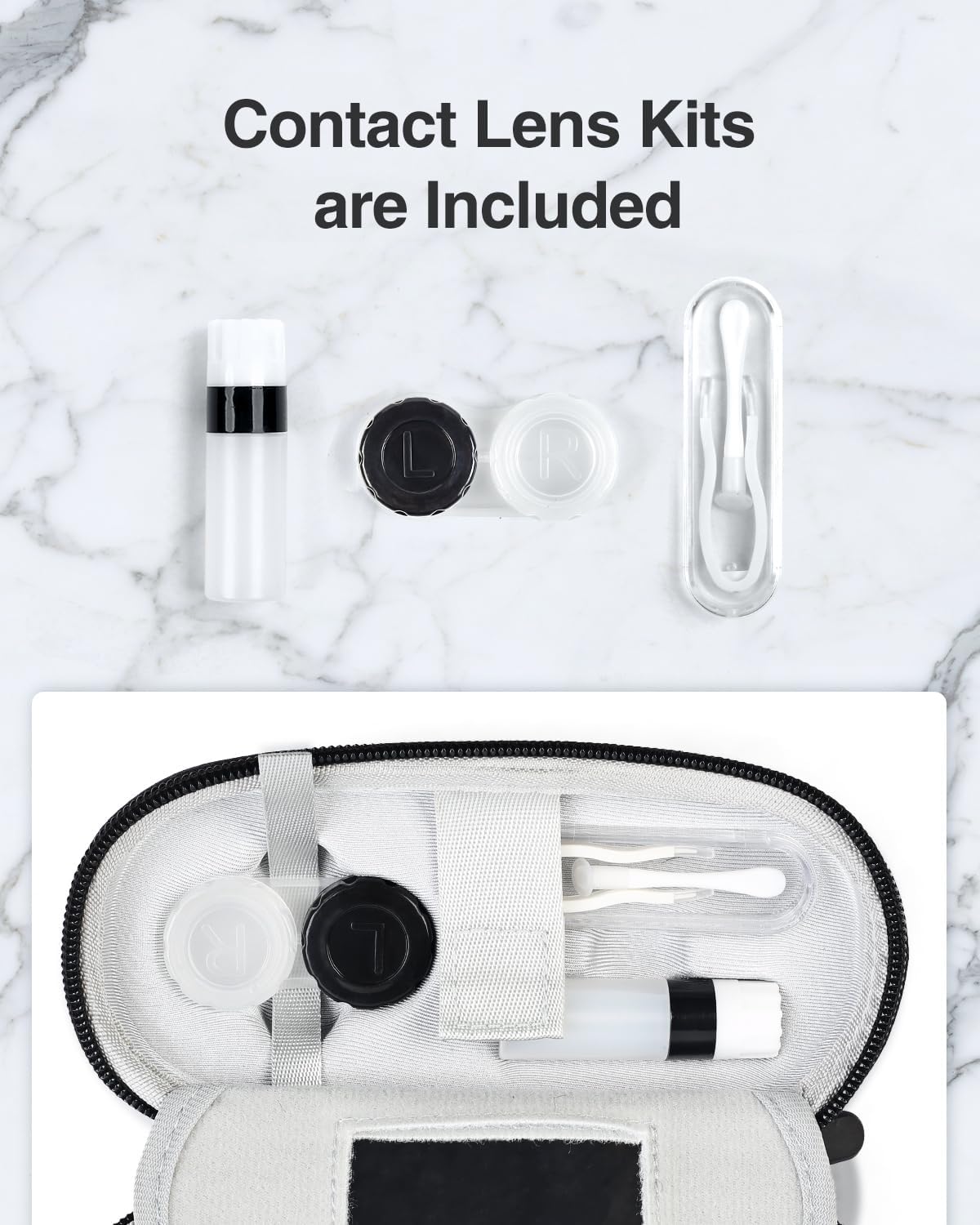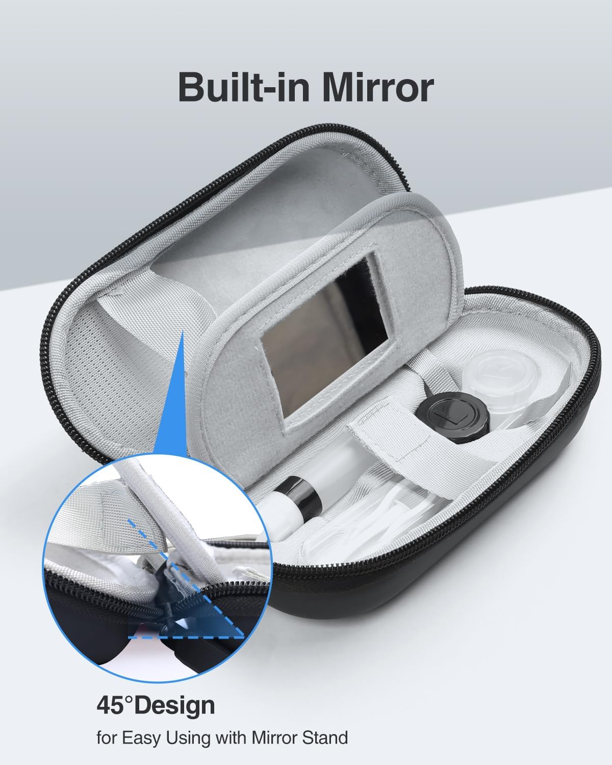 Review: This is the most wonderful contact lens case. It has everything you in one hard case that really isn’t any bigger than a sunglasses case. Its very portable, very durable, enough room (and a mirror), velcro to hold things from flying around when its around your wrist. The velcro also holds up the mirror so you can see better. I believe it comes in different colors, but black had the cheapest price. Not that it was expensive to begin with.