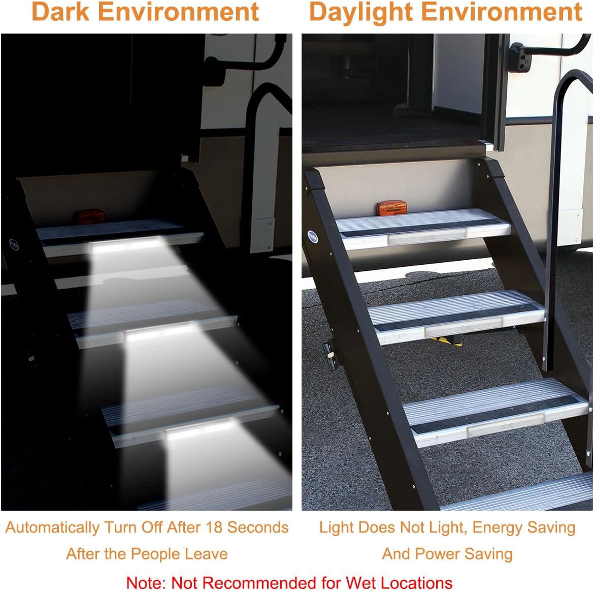 【Motion Sensor RV Step Lights】Magnetic motion sensor light on the PIR sensor can detect human movement up to 10 feet, it will automatically illuminates in the dark once the movement is detected, providing you with a safe and convenient way to navigate your surroundings. When no movement and other light sources are detected, it automatically shuts down after 18 seconds, saving energy and extending life.