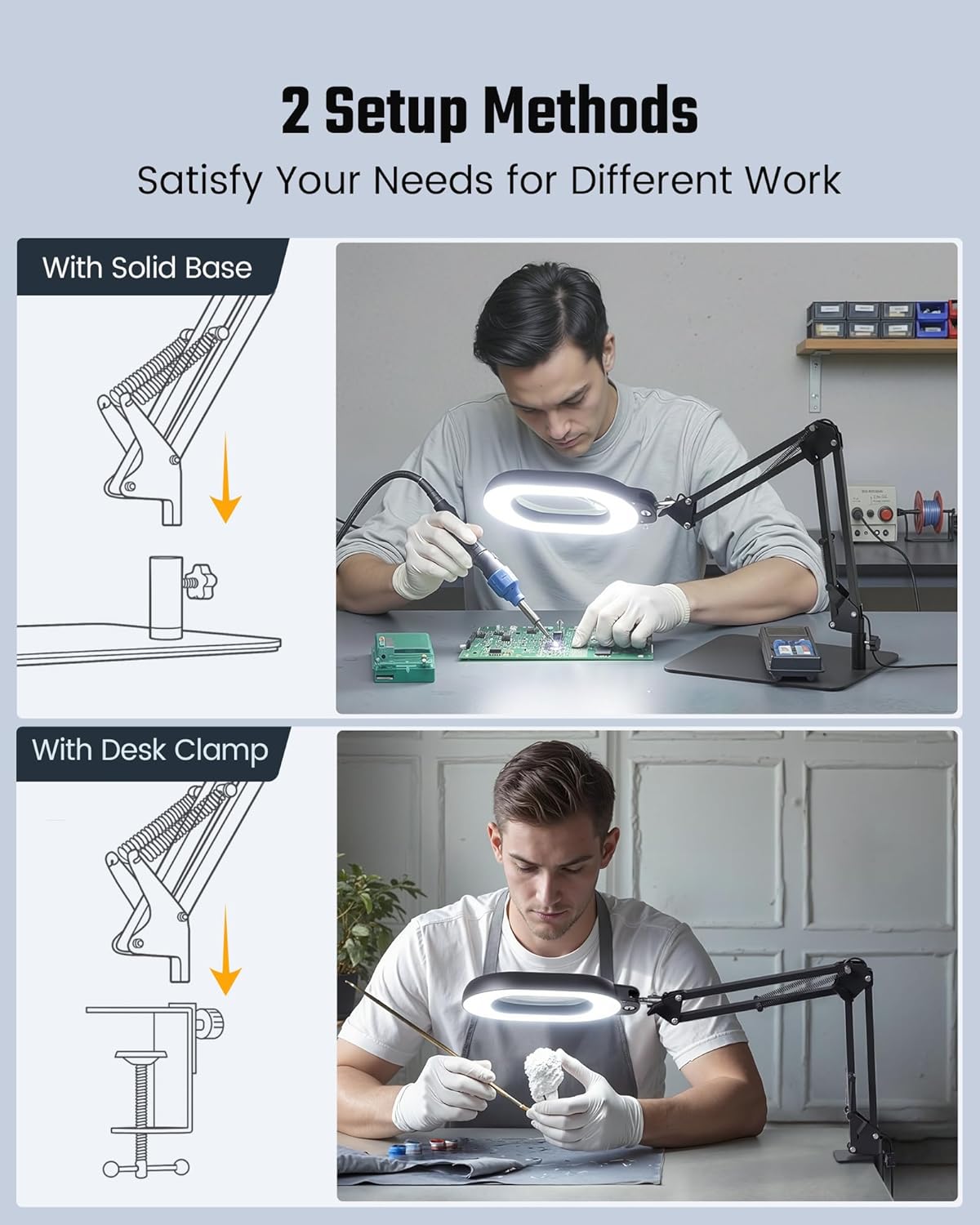 Review: Light settings are excellent providing various color hues and brightness levels. Easy to switch between stand alone base and clamp base. Magnifier works great with no distortion.