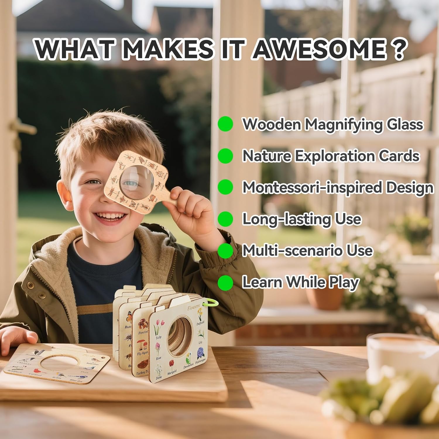 Review: This wooden Montessori magnifying glass set is such a hit with my kids! The magnifying glass is sturdy, safe, and just the right size for little hands, making it easy for them to explore leaves, bugs, and rocks outside. The included wooden bug cards add an extra layer of fun and learning. They spark curiosity and help kids identify different insects.It’s a wonderful educational toy that encourages outdoor play, observation skills, and a love of nature. Perfect as a birthday gift or everyday activity for children ages 3 and up. Highly recommend for curious little explorers!