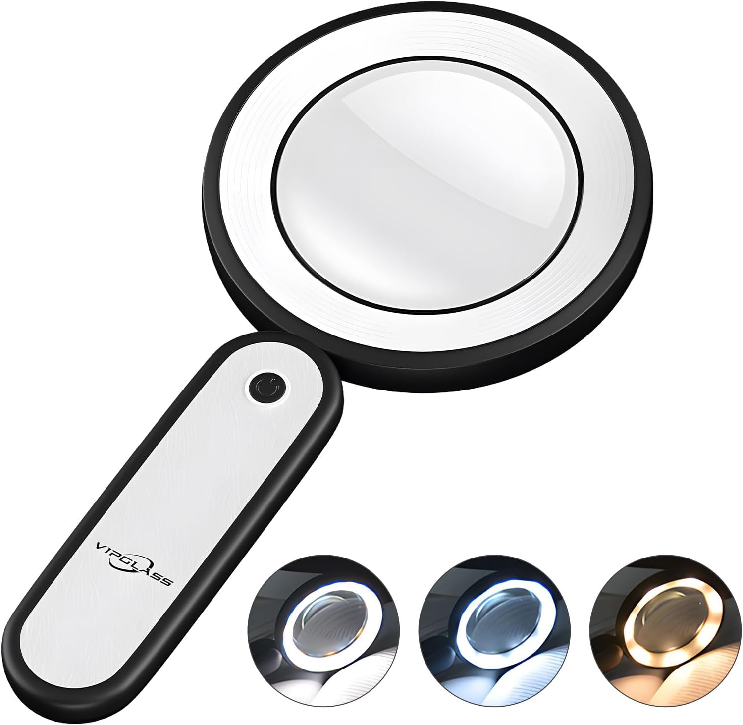 VIPGLASS Magnifying Glass with 21 LED Lights,10X Handheld Large Magnifying Glass,3 Color Lighting Modes Magnifier for Children and Seniors