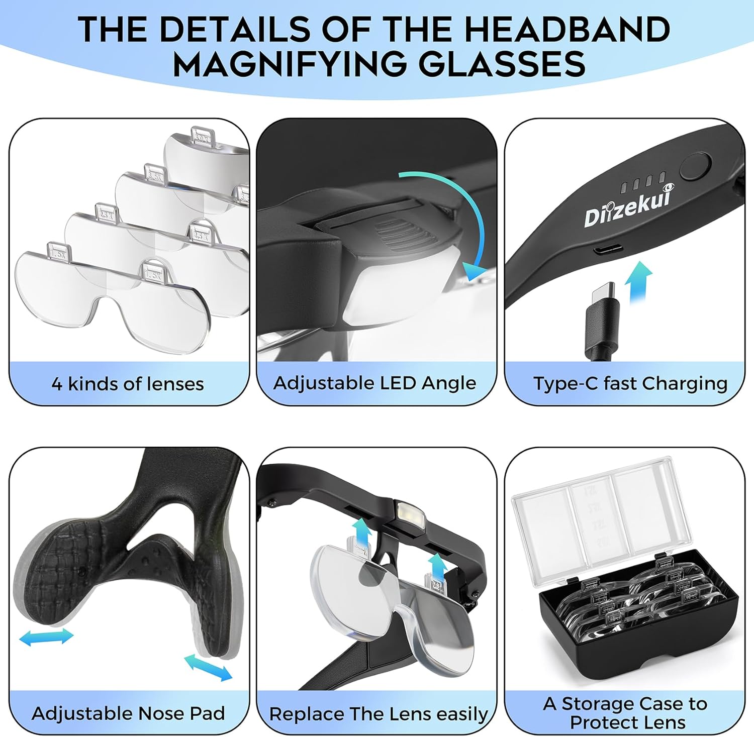 Review: Seem to be built very good , but they are still plastic. Lenses just snap into place and are very clear and nice, they as well are plastic , they do not move once snapped into place but are big enough to see what you are working on.2 light settings, low and bright and they are bright LED’S. Head band is either a rubber or silicone material. Head band is a little snug around my head and I don’t have a big head. Glasses do stay in place on my head without the headband. It comes with a cool case for the extra lenses. There are 4 lens choices, 1.5, 2.5, 3.5 and 5.0. I can see very well with the 1.5 lense choice. It also had a lens cleaning cloth included as well. Very nice set for the price and are great for working on small hobbies such as model railroading in my case. I very pleased with them as they ate comfortable to wear