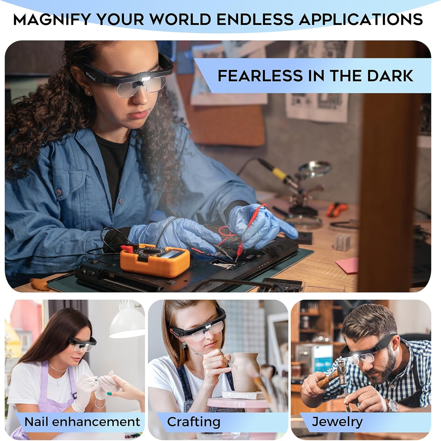 Review: I bought these because I need to be able to read labels, and I was tired of using small handheld magnifying tools for the job. I never knew I needed a pair of these until I tried them out. Oh my goodness, these are PERFECT — they make it easier to read labels, my phone, many things, actually… I have two hands free to do things, and I find the 2 light options to be fantastic. The light does run out after several hours, but I don’t care because I can just charge them and not worry about buying batteries or figuring out how to put batteries in. The directions need to specify how to remove the magnifying glasses from the frame to switch them out — I’m still not sure how to do it, but I just keep pressing on different parts of the frame over the eyes and eventually, they come out with a pull. Overall, I’m extremely satisfied with this buy — I find it very helpful to be hands-free and have several magnifying size options to choose from. This is also a great price!