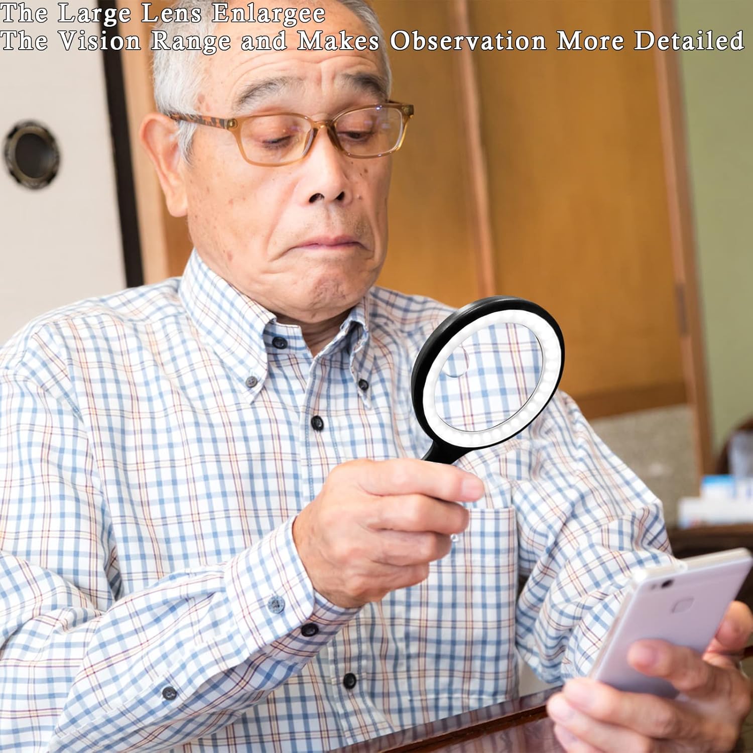 Review: I bought a few different magnifying glasses for my mom, who loves to read but has cataracts. This is her favorite out of all the various magnifications, lighting sources, etc. It’s easy for her to hold, the magnifications are great, and her favorite feature is the lighting. She says the lights around the edge of the lens makes reading so much easier than on the magnifying glasses that have their light at the base of the lens/top of the handle. I wouldn’t change anything about this, but I WOULD like to see an even bigger version, maybe a couple inches bigger in diameter. She’s used a LOT of different magnification sources, from hand-held to the ones you lay on top of the page, and this is the one we’ll buy again if the need arises.