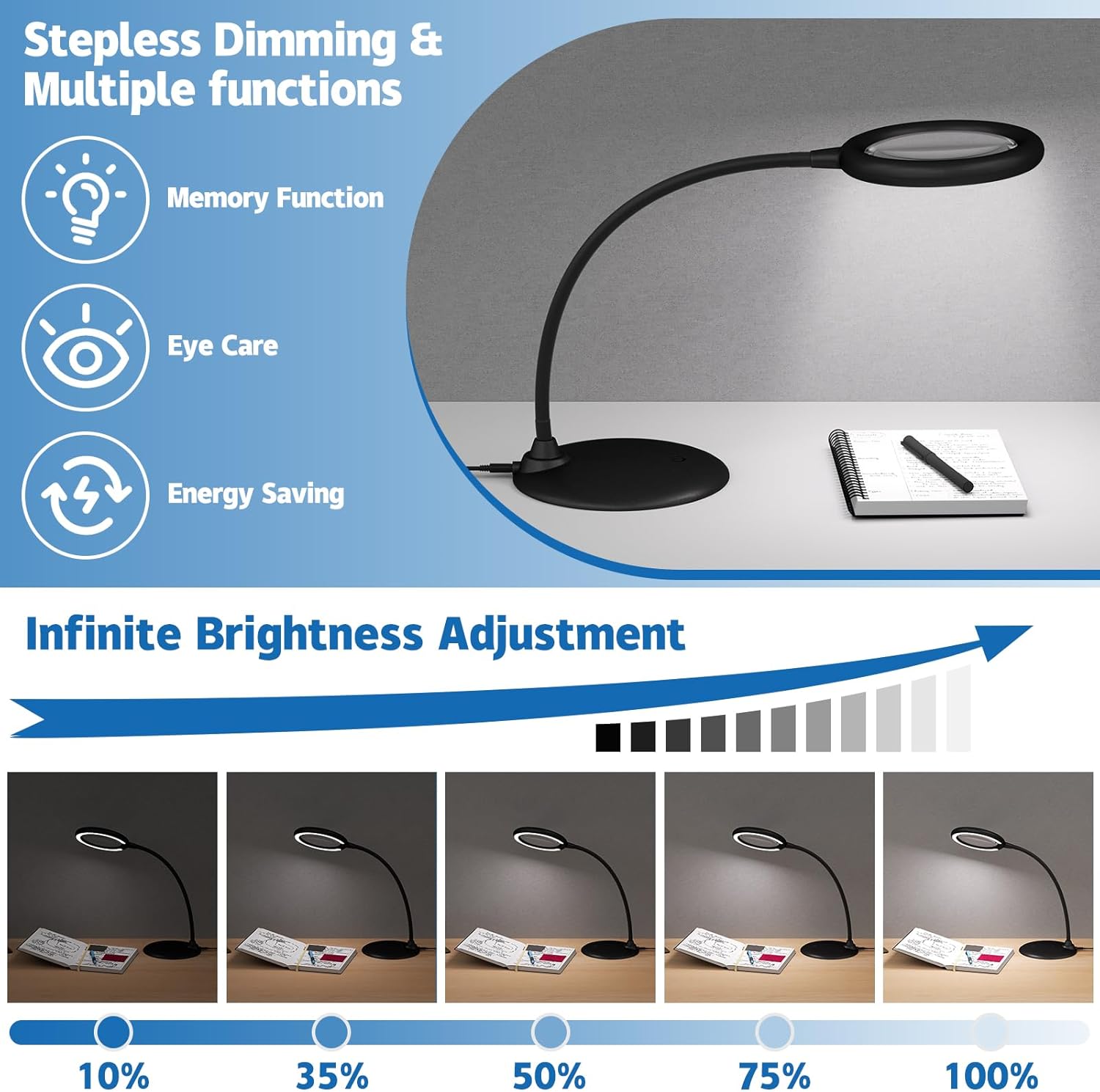 【Magnifying glass with 28pcs LED light】This magnifying glasses with light for close work features 28 high-brightness LED beads with a light range from 0% to 100%. Can be used as a desk lamp. Equipped with 5x optical glass, it also can be used as a magnifying glass to facilitate your Daily life.