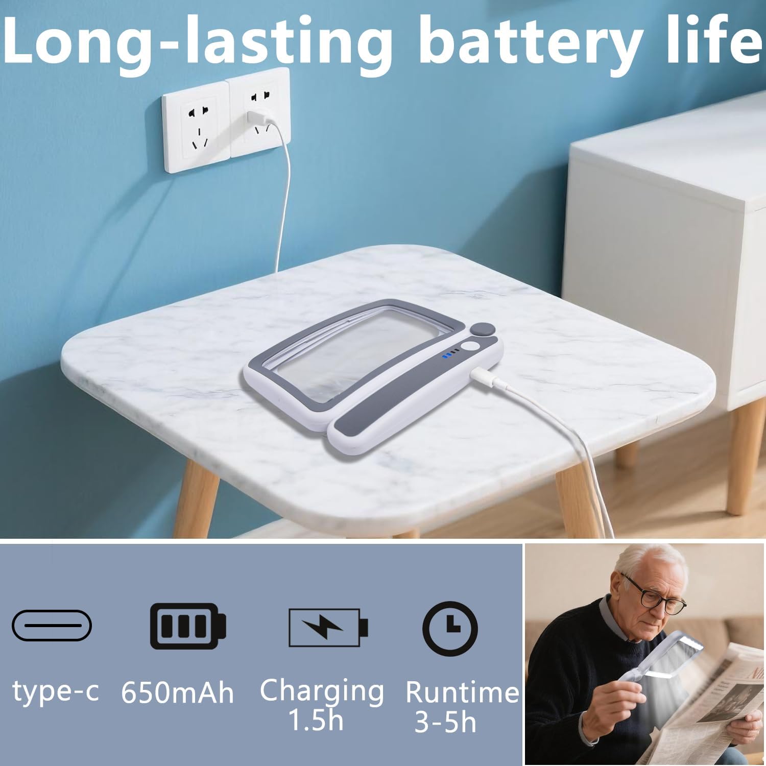 Review: The rectangular shape is honestly the biggest selling point; it gives you such a wide field of view, way better than those circular lenses that force you to reposition every few seconds. magnification works perfect for books, maps, and threading needles, my grandma can finally read the newspaper again without getting frustrated. The lighting is powerful, and the one-touch adjustment makes it simple to dim it down if you’re using it late at night. Super happy that is rechargeable w/ usb c, no more dealing with expensive batteries, which is a massive win for everyone. It folds up neat and is very light weight, so portability isn’t an issue at all. The little swivel angle feature is handy if you want to set it on a table, which is much better than holding it the whole time. A really practical item, Definitley recommend this for seniors, pretty solid purchase overall.