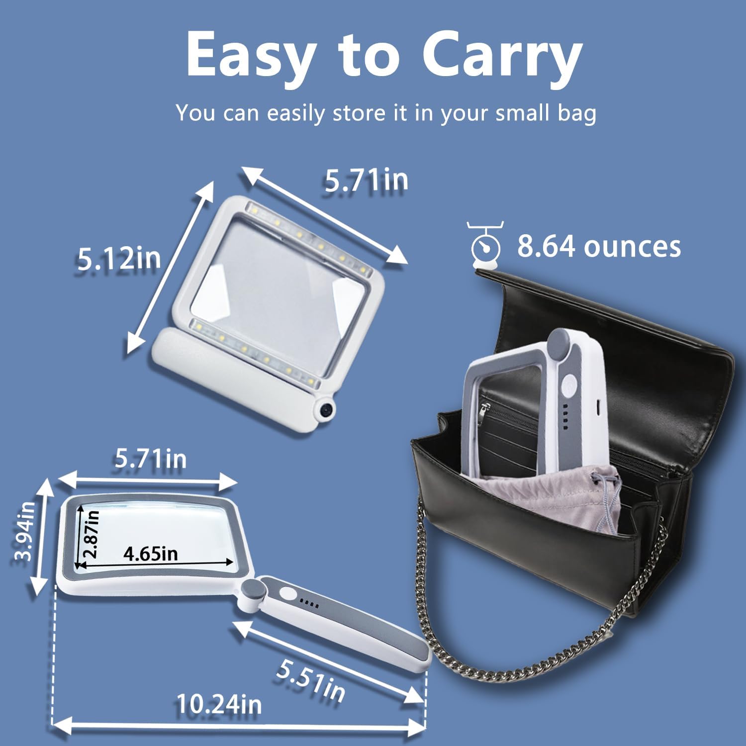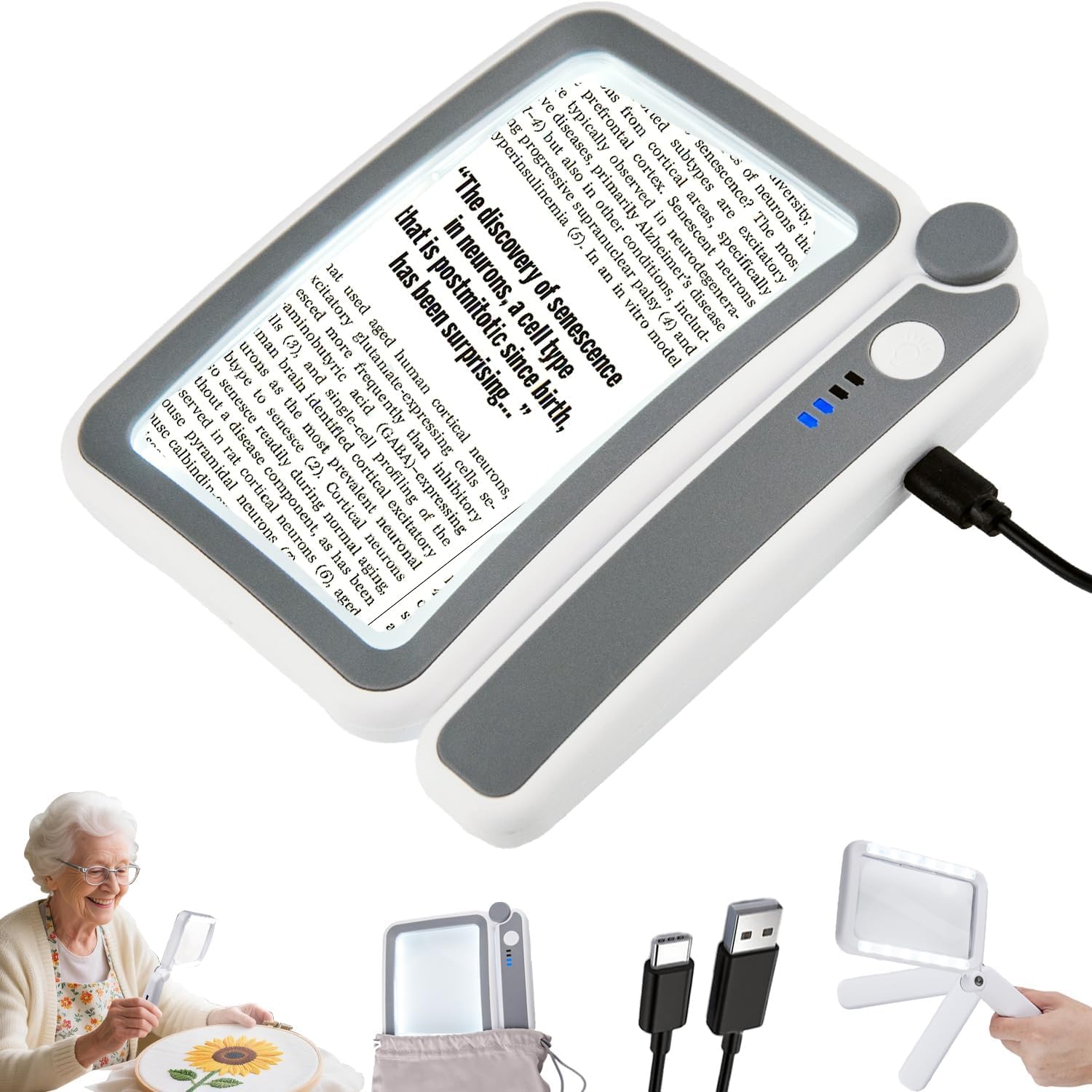 Review: Thingogear Folding Handheld Dimmable Magnifying Glass with Light – Rechargeable 3.5X Rectangle Large Portable LED Full-Page Magnifier for Reading, Small Print, Books, Seniors & Low Vision is a practical, easy-to-use tool for reading, crafting, or small-print work. Its rectangular lens provides a wide, clear viewing area, and the built-in LED light with three brightness levels works well even in dim settings. The foldable design, lightweight build, and ergonomic shape make it comfortable to hold for extended periods, while the rechargeable battery adds convenience. Though the acrylic lens requires careful handling and magnification is moderate, it offers excellent value for seniors, hobbyists, or anyone needing low-vision assistance. It’s a bit big and thick to bring to dimly lit restaurants or other social areas though.