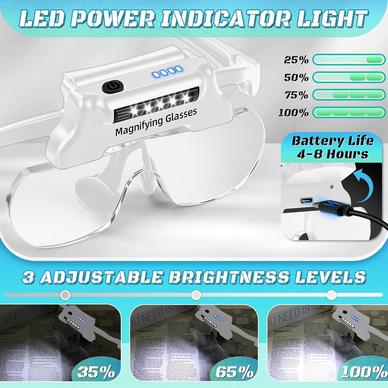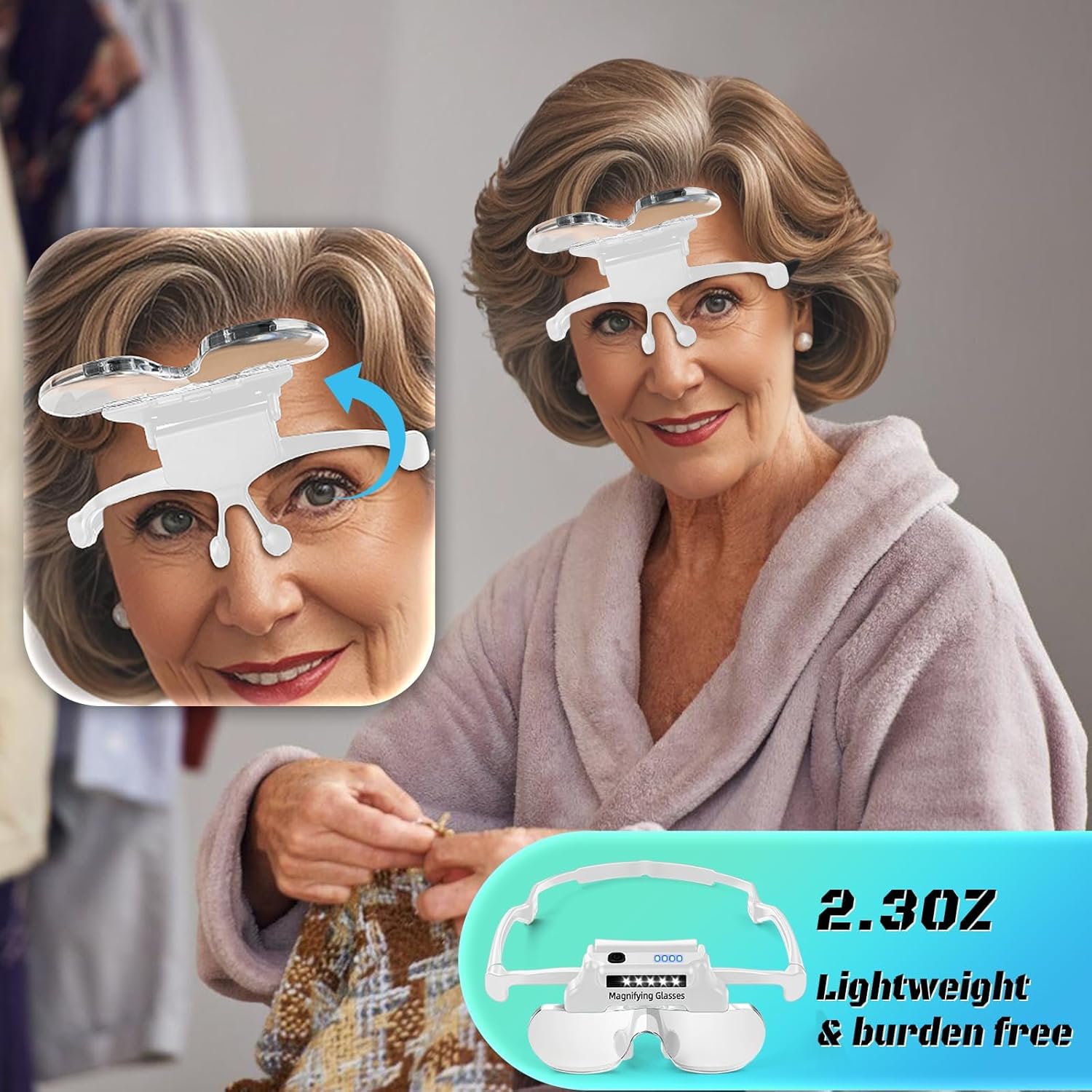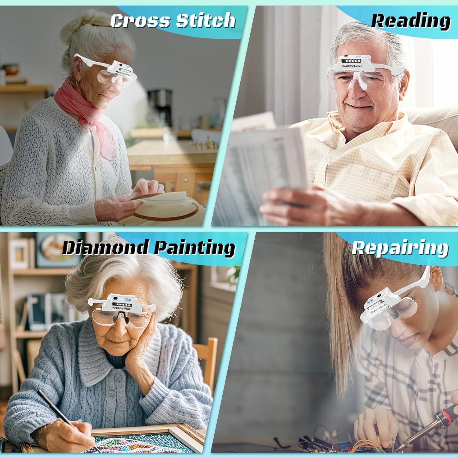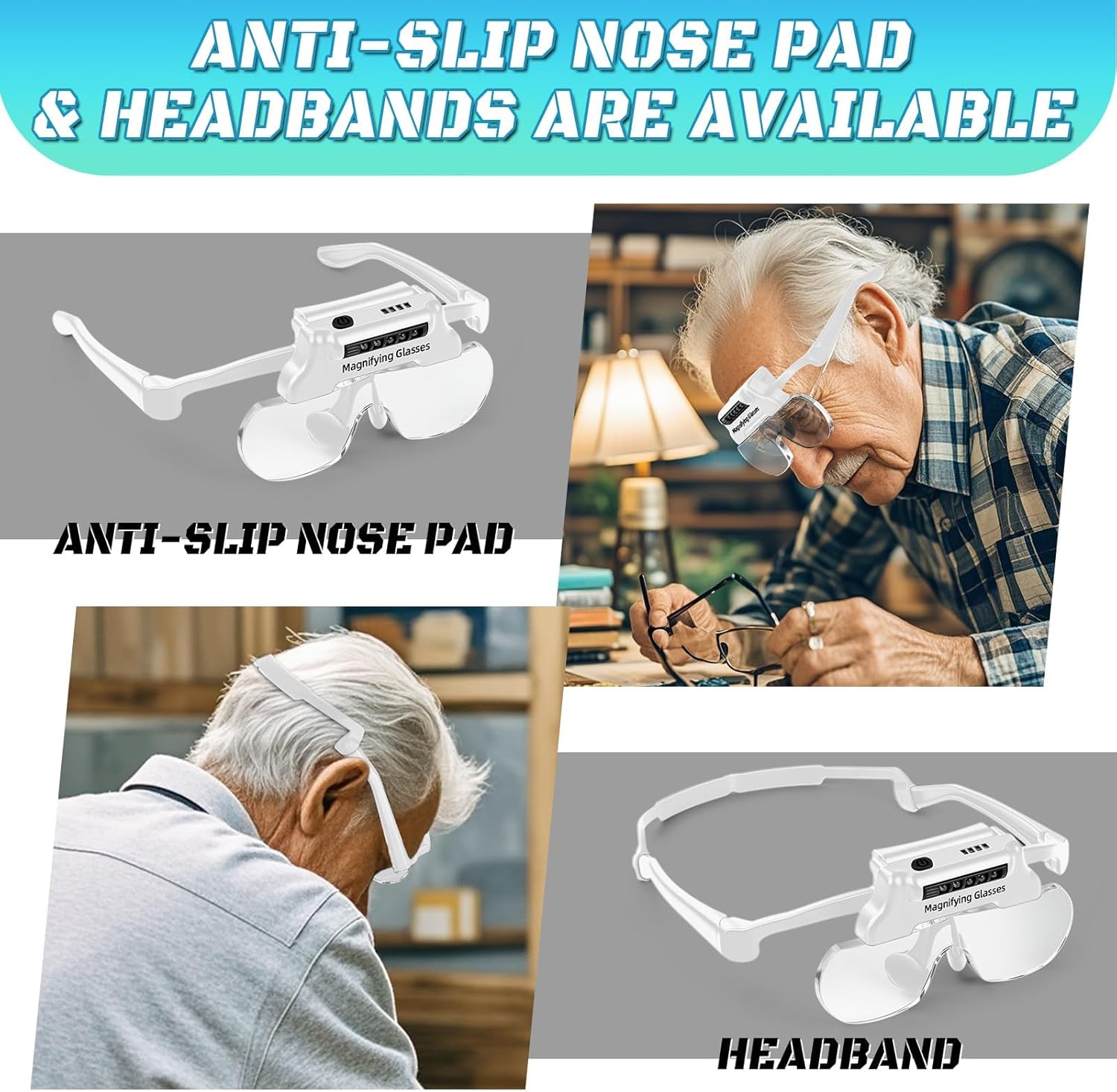 Review: This magnifying headset exceeded my expectations. The best part is that I was able to wear it comfortably over my regular glasses. Thanks to the included elastic strap that attaches to the arms of my glasses, it stays firmly in place without slipping or falling off my nose.The magnifying lenses are very clear and sharp, providing crisp and detailed images when viewed from the correct distance. The built-in LED lights are surprisingly effective and really help illuminate the area you’re working on, especially in low-light conditions.Considering the price, this is a fantastic product. The included storage case for the lenses is also a nice touch. I highly recommend this for anyone who works with small parts, does DIY projects, or needs precise magnification for close-up tasks.