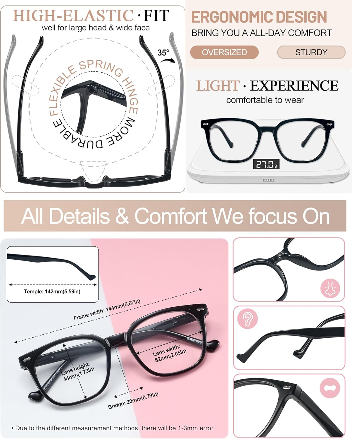 Review: These glasses are fine, but not as pictured. The photo of the seller shows is of oversized glasses on a face. The glasses received were large, but not oversized lenses but much narrower than what you would call oversized. I believe the glasses would look proportioned to match the photo if I put them on my five year-old niece. They claim that they are 144mm wide. The glasses received were only 139mm wide.