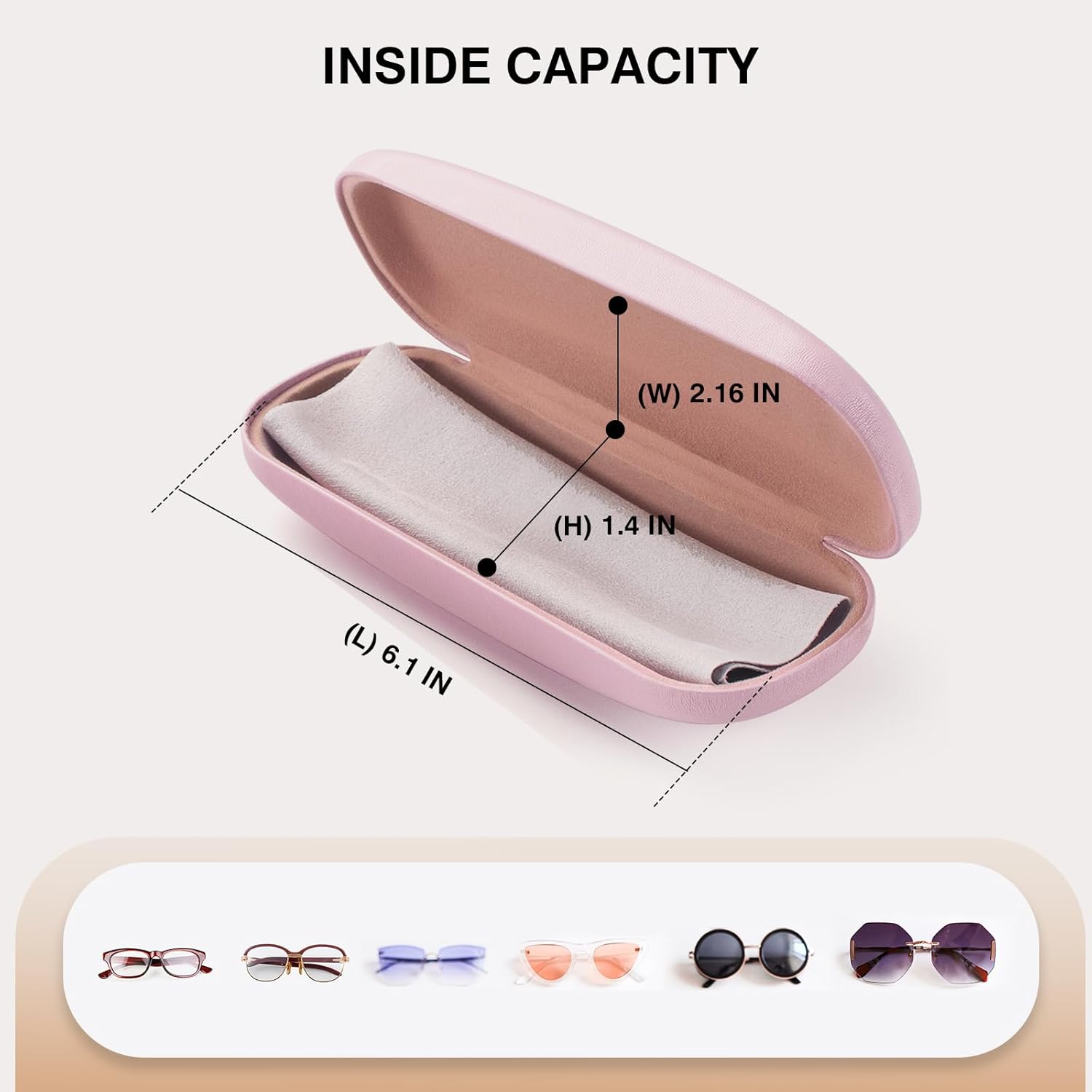 Review: I bought the light pink. It’s a very soft light pink color. It came with a polishing cloth that is a good size for my glasses which the lenses are on the larger size. It’s very sturdy and the hinge is nice and tight. It has a decent lining on the inside with a nice velvety feel. My frames are on the larger size to accommodate my tri-focal lenses. They fit in this case very well. For the price it’s a very nice and well put together case. I like it very much and will be ordering a couple more for my spare pair and my pair of prescription sunglasses.