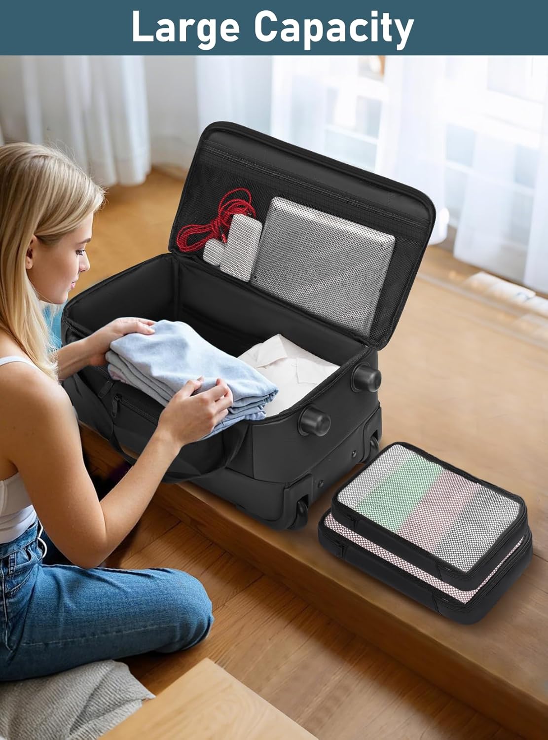 2 Packing Cubes: Dimension: 9.6*9.3*20.1 inches. Duffle bag with wheels and handle comes with 2 packing cubes to keep your clothes or small items organized. With the spacious main compartment of the wheeled luggage bag, you can pack everything from clothing and shoes to electronics and travel accessories in one place, ensuring that your items are neatly organized and easy to find. It's perfect for weekend trips, business travel