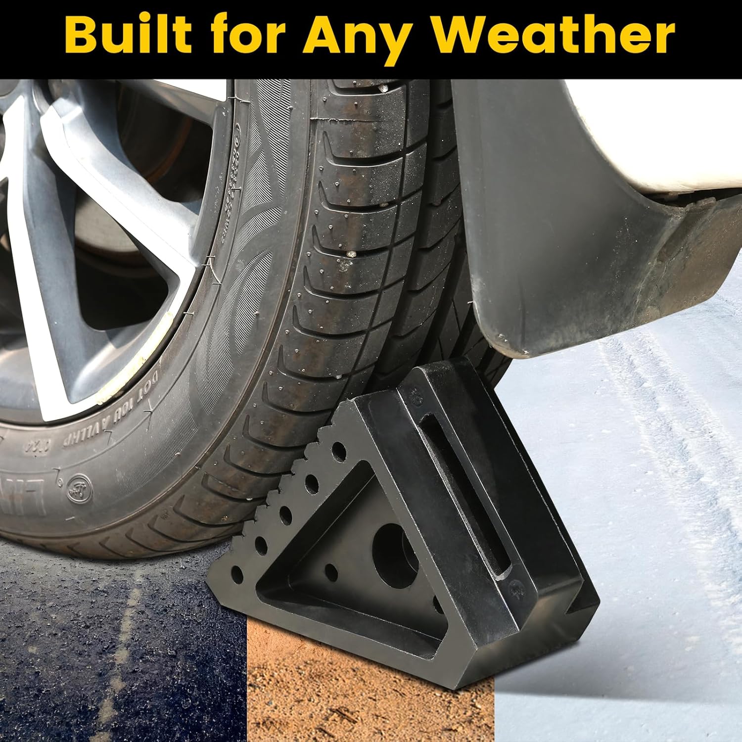🚧 All-Weather Construction: Engineered to withstand rain, snow, oil, and UV exposure, these chocks are perfect for indoor or outdoor use in any climate or season.