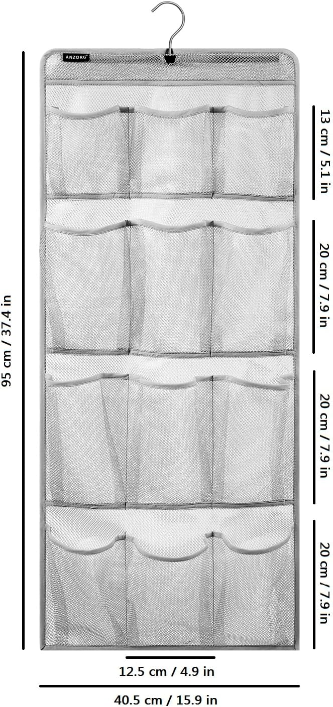 Bathroom shower organizer measures 37.4" H x 15.9" W with 12 mesh pockets. 3 Medium pockets with 5.1" H x 4.9" W, suitable for organizing razors, shavers, toothbrushes and soap,etc. 9 Large pockets with 7.9" H x 4.9" W, suitable for holding cream, facial mask, body lotion, toiletries, towels, hair dryer, shampoo and conditioner, etc.