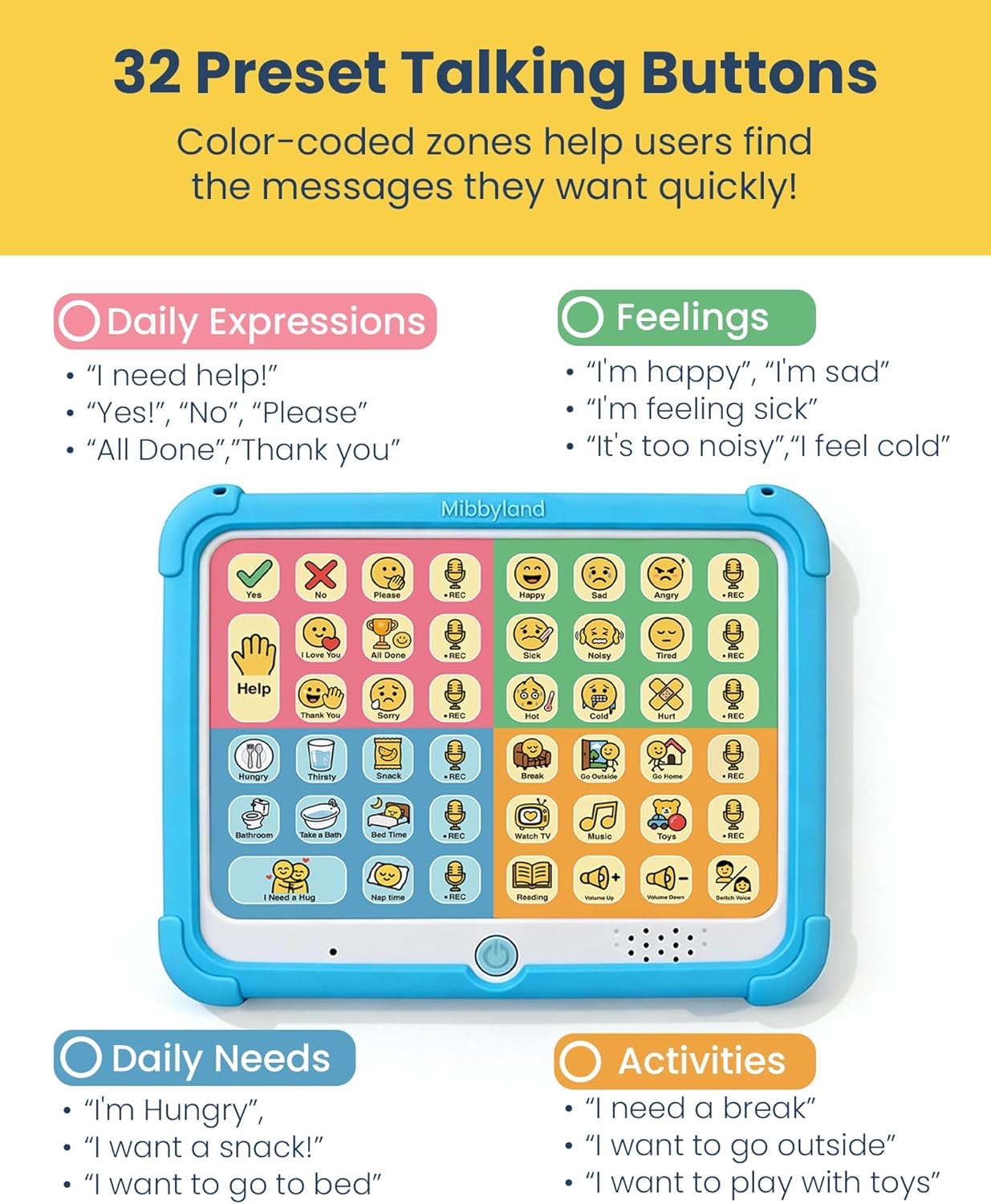 Review: This AAC device is actually really thoughtfully designed. It comes ready to use, but one of the best features is that you can record your own messages. There are multiple recordable buttons, around a dozen in total, which gives you a good amount of flexibility to customize it to your child’s specific needs.I really like how everything is separated by color. For example, the blue section focuses on feelings with phrases like “I feel sad,” while other colors group things like actions, such as “I want a break.” That visual organization makes it easier to navigate and helps reinforce categories in a clear, structured way.The buttons are easy to press and responsive, and the device itself feels lightweight but sturdy enough for daily use. It’s simple, which can actually be a big plus if more complex devices feel overwhelming.Overall, this feels like a solid, beginner friendly AAC option that balances structure with customization. The color coding and ability to record your own phrases make it adaptable without being overly complicated.