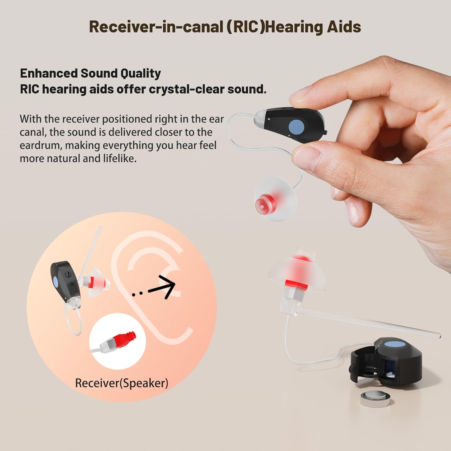 ⭐Smallest RIC Design⭐ – The mini RIC hearing aid is our most compact model, making it almost invisible when worn and comfortable for extended use.You can confidently wear it in social settings without drawing any attention to your hearing aid, allowing you to focus on the conversations and sounds around you without feeling self-conscious.