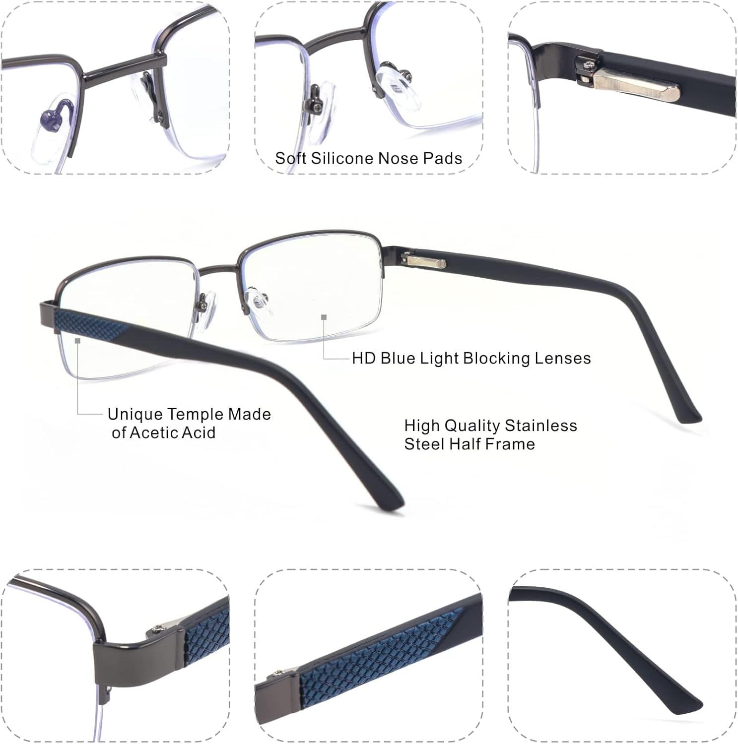 Review: These glasses fit well, have appropriate amount of spring to hold against my head comfortably, are light enough for wearing all day, and have a blue blocking effect. So far, they haven’t become loose like other pairs I’ve owned, showing that quality parts were used in the manufacturing process. I use them while in front of a computer screen at work and enjoy being able to see the screen and being able to look upward to people at a different magnification — these rival my prescription glasses at a fraction of the cost! Pictures are uploaded of the glasses and the included information brochure.