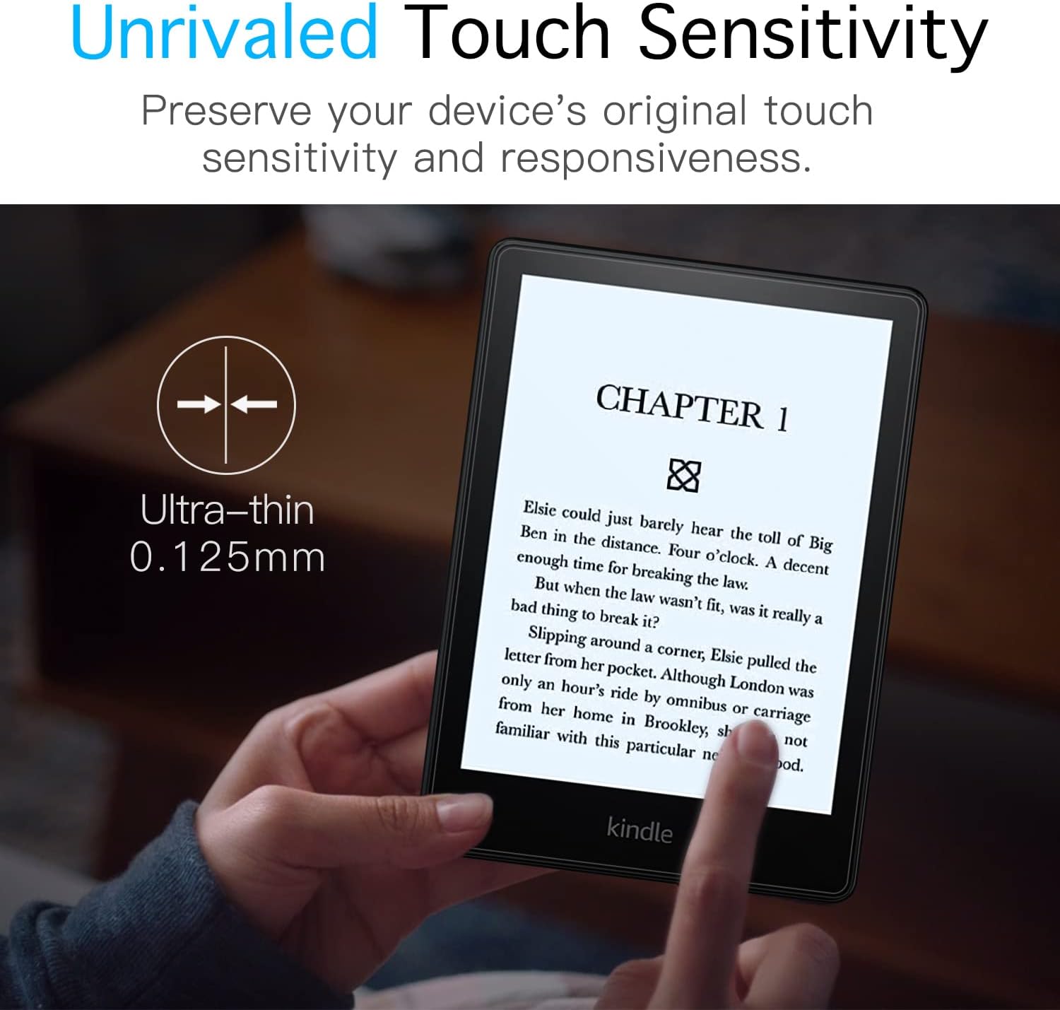 Review: First off, customer service was excellent. Quick to respond and understanding to my concerns.The protector’s quality is great. Looks just like the Kindle’s regular screen, and there is no decrease in sensitivity. The size is a bit smaller than the actual screen, but that’s really not an issue. Overall, I forget it’s even there.Unfortunately, it is very difficult to apply without bubbles getting in, even with all the tools provided. I was able to, but only on my 4th attempt. I think selling 3 or 4 at a time for a couple more dollars would be ideal.