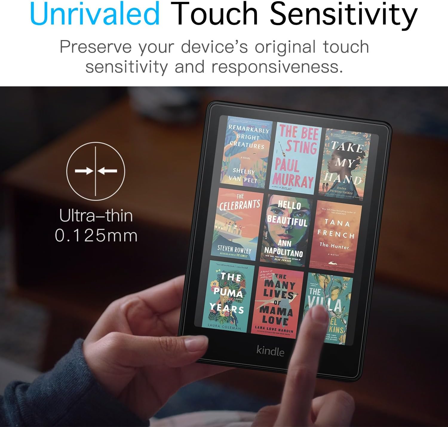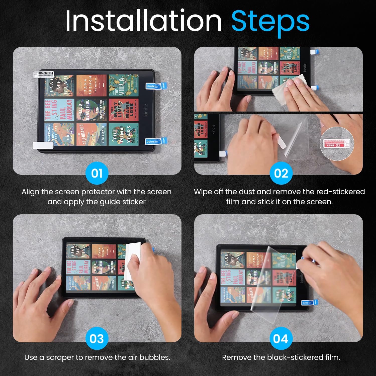 Review: Firstly, I’m not the most skillful person and I never did this before. All I needed was included in the kit, with easy instructions to follow and two spares of everything if I failed…… Well, I succeeded on the first try, protector fitted perfectly and all the air bubbles were pushed out with the supplied card tool.After installation, I tried out the touch screen on my Kindle and it works as well as without the protector.Since I use my Paperwhite every day, this is a good way to protect my investment.