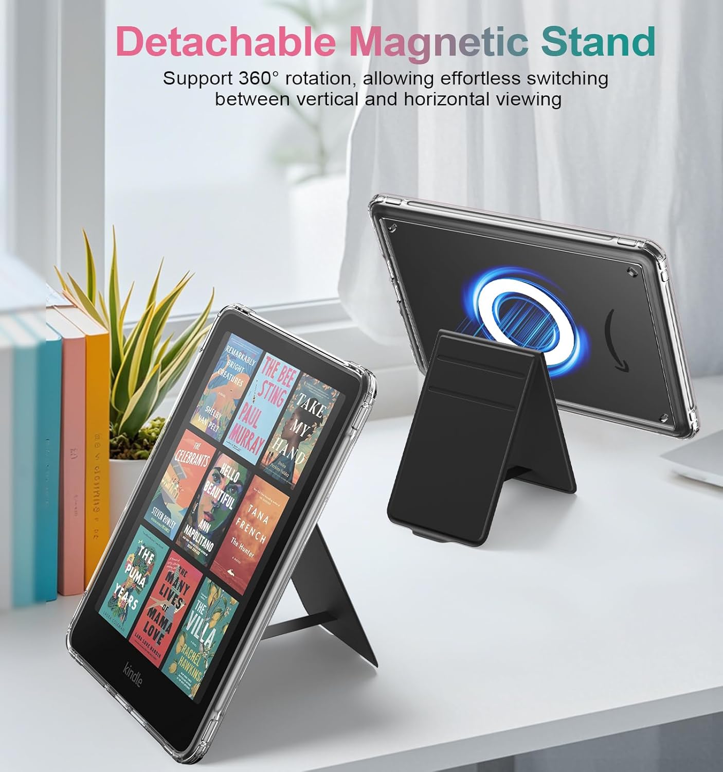 Review: This is great and super easy to use! I like that it is not bulky on my case and I can use it anytime, anywhere! Most stands are big or require a large setup but this is so sleek and portable! The magnet strength could be a little better. It is strong enough to hold the kindle but still feels like you could knock it off easily.