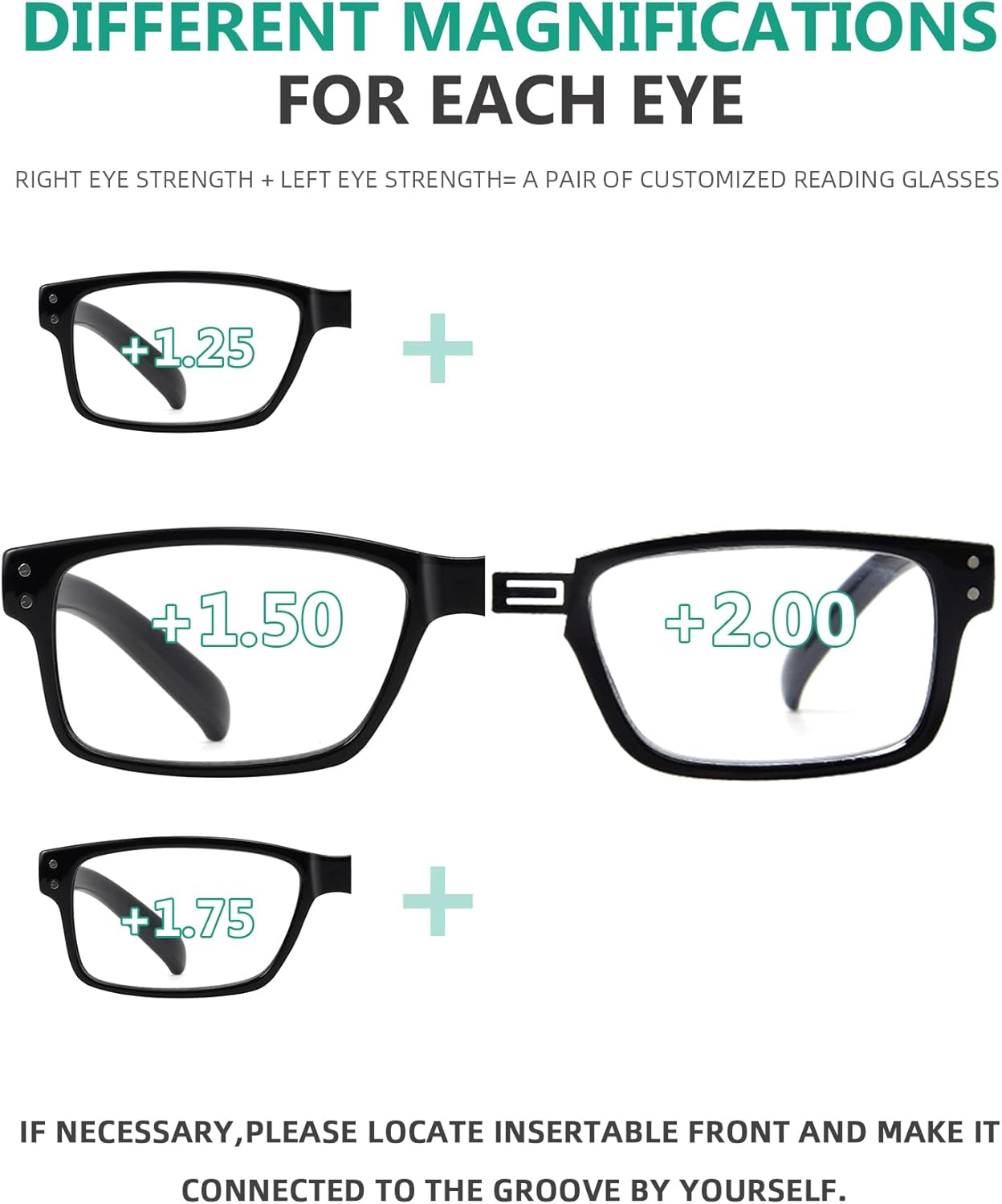 Review: These things are exactly as advertised. They snap together and are seemingly seamles!My left eye is weaker than the right so mine is a 1.5 L / 1.25 R,I wish they came in a low rise no frame, but I can scootch them down on my nose and peer over them ( I learned) .Not stylish, so I don’t wear them out, but perfect for laptop use. A bit wide for my face.