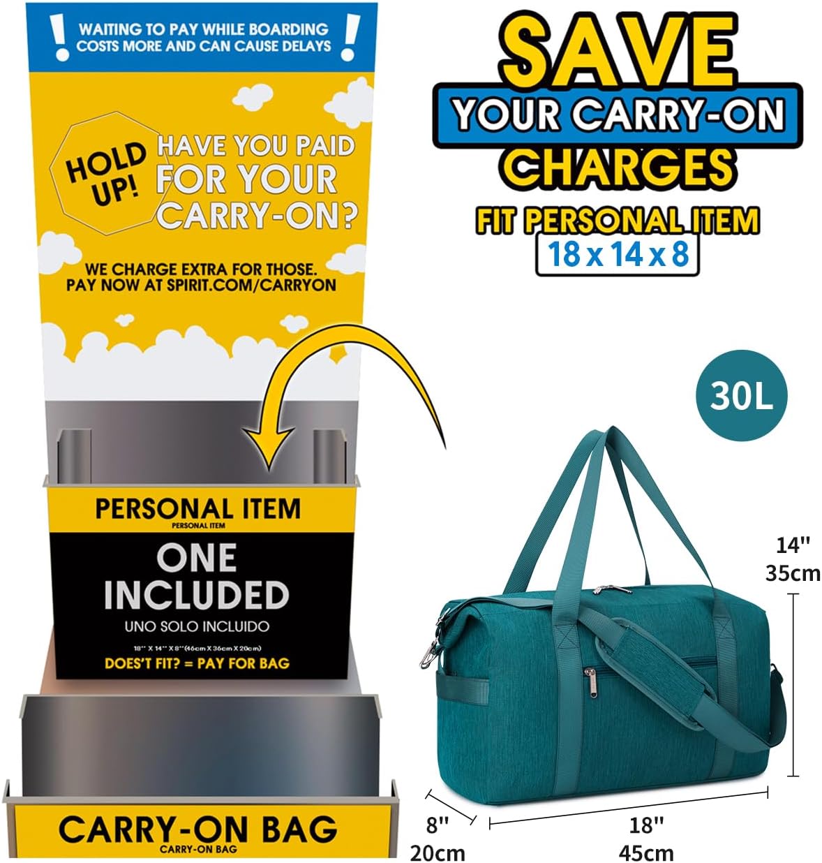 Airline-friendly Travel Bag. Bag size 18x14x8 inch (Capacity 30L) fits personal item size 18x14x8 of Spirit Airlines & Frontier Airlines, which can be placed under seat and no need to pay carry-on. Wide-open 30L main compartment could accommodate all your travel items for 3 to 4 days or a week's worth of clothes