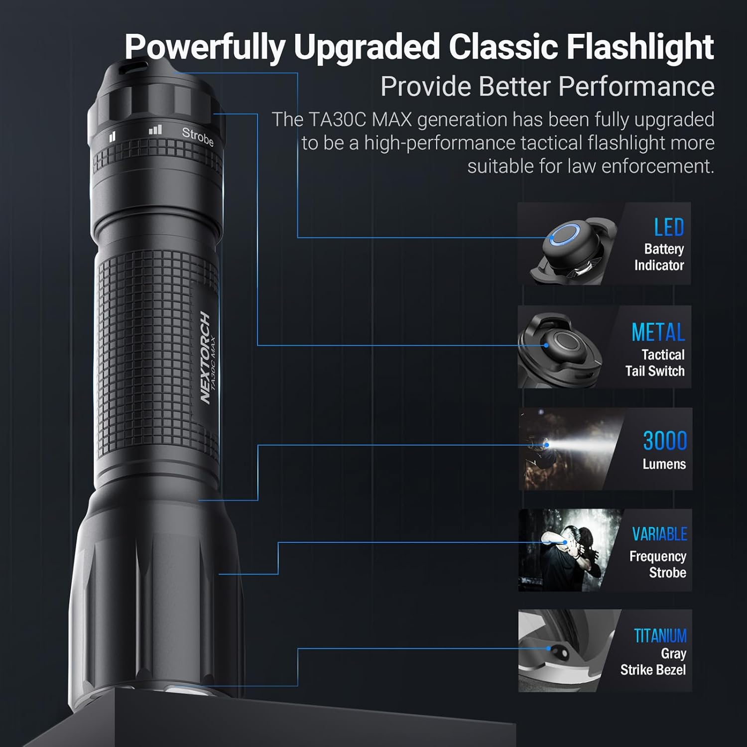 【PROFESSIONAL CARRYING TACTICAL FLASHLIGHT】NEXTORCH TA30C MAX tactical flashlight high performance produces up to 3000 lumens of output with a beam distance of up to 390 meters. 6.02 inches (L) 1.50 inches (head diameter) 1.10 inches (barrel diameter) compact LED tactical flashlight weighs 5.39 oz (without batteries), achieve a balance between performance and size, hardcore and compact, suitable for both tactical and commuting purposes.