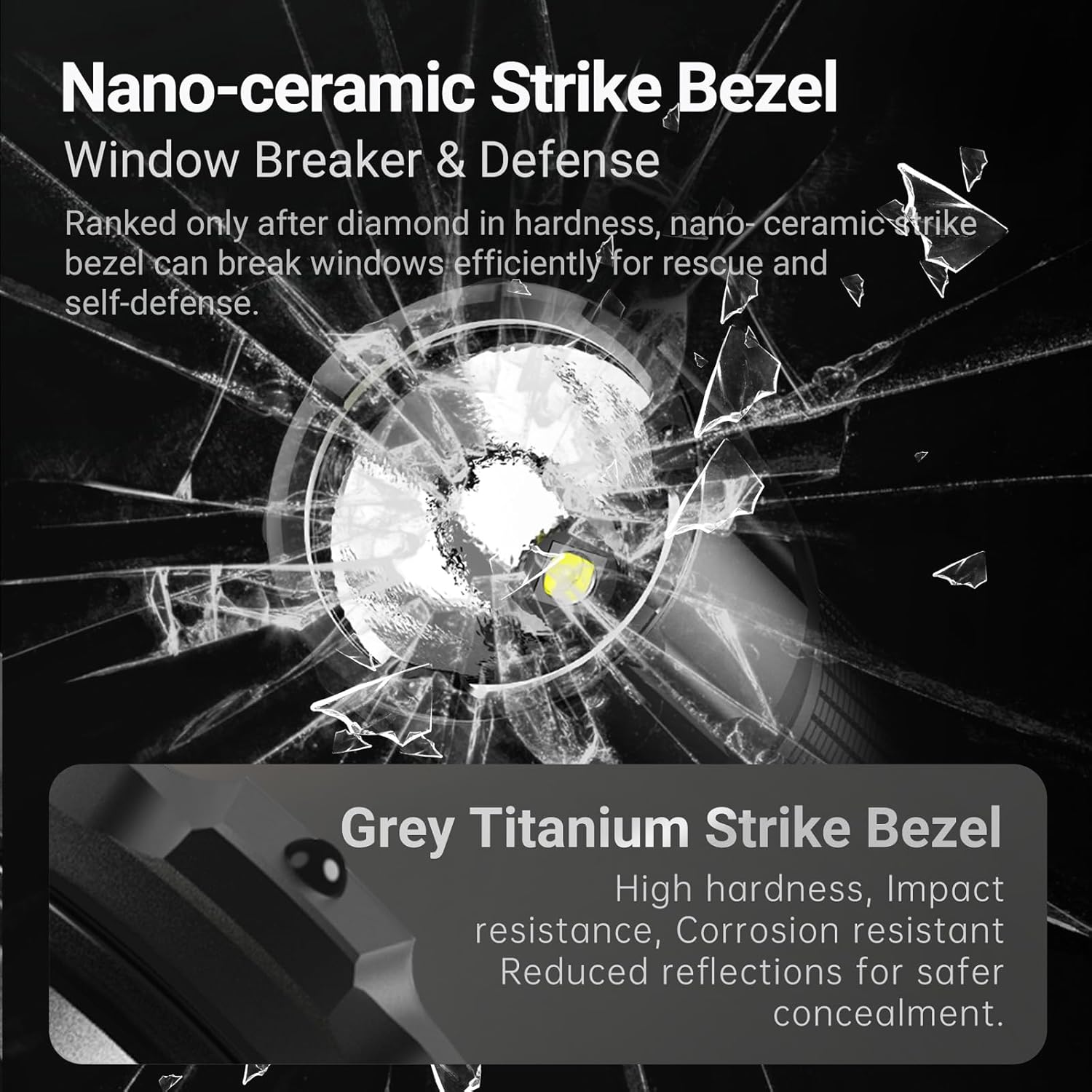 【MULTI-FUNCTIONAL UNIQUE DESIGN】NEXTORCH tactical flashlight patented design, TA series unique mute button for tactical, rotary magnetron, switch tactical, high brightness, medium brightness, low brightness, strobe mode, match different use needs. Five light modes 3000 lm (390m), 520 lm (160m), 70 lm (60m), momentary on, strobe, and ultra-high hardness ceramic bead attack head, hardness is second only to diamond, can quickly break the car window glass, to meet the unarmed defense, window rescue, tactical break-in and other emergency needs.