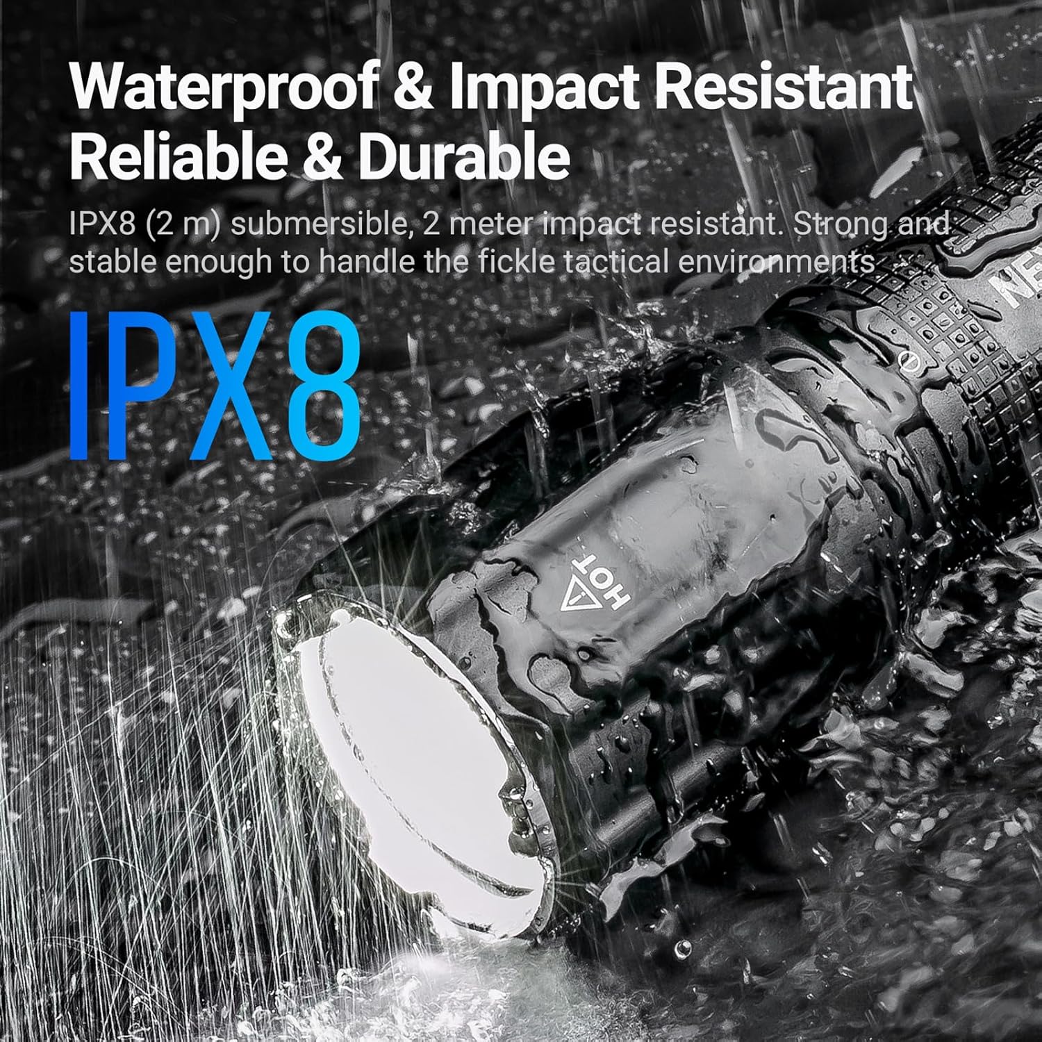 【WATERPROOF & INDESTRUCTIBLE QUALITY】NEXTORCH high quality tactical flashlight is waterproof and drop-proof, reliable and durable. 2 meters drop-proof, IPX8 (2 meters) waterproof, more comprehensive for more peace of mind! The surface treatment hard anodized aircraft grade aluminum alloy material makes this flashlight sturdy and stable enough to handle changing tactical environments as a law enforcement flashlight.