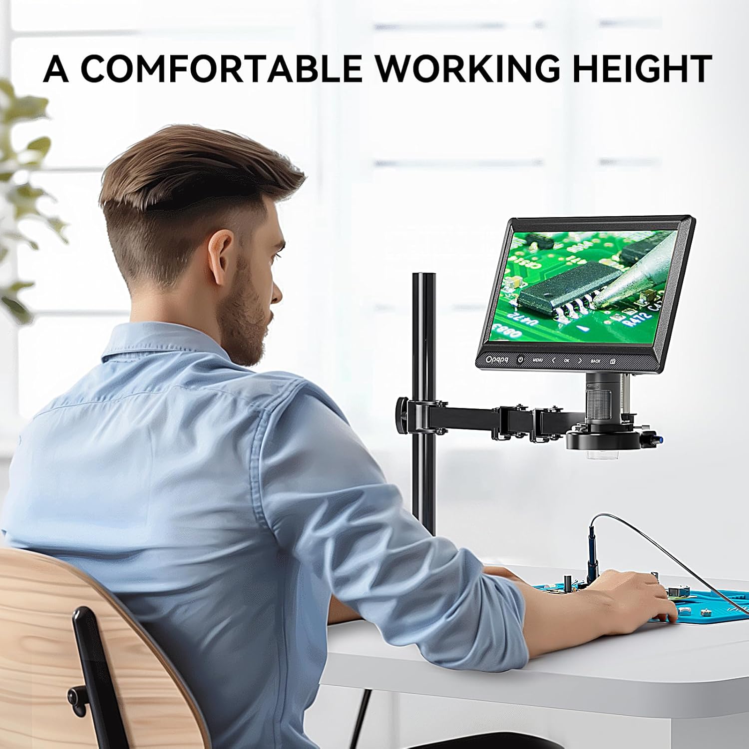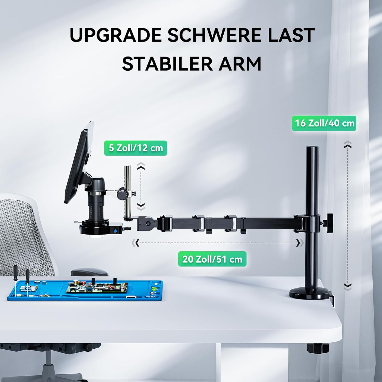 Review: This thing is pretty awesome.  Opted for the adjustable desk clamp arm so it had more versatility.  Focus knob works great and gets you in REALLY close to your work.  I had a connector on a laptop that needed repair and is only about 2-3mm across.  This zoomed in to show it about an inch across on the screen with excellent detail.  Honestly, surprised it works as well as it does, so I highly recommend this unit.  Build quality and components are all excellent for this price point.  Really cool device for repair work or curious exploration.  Homeschooling or science teaching would be a whole new level of awesome with this device!